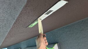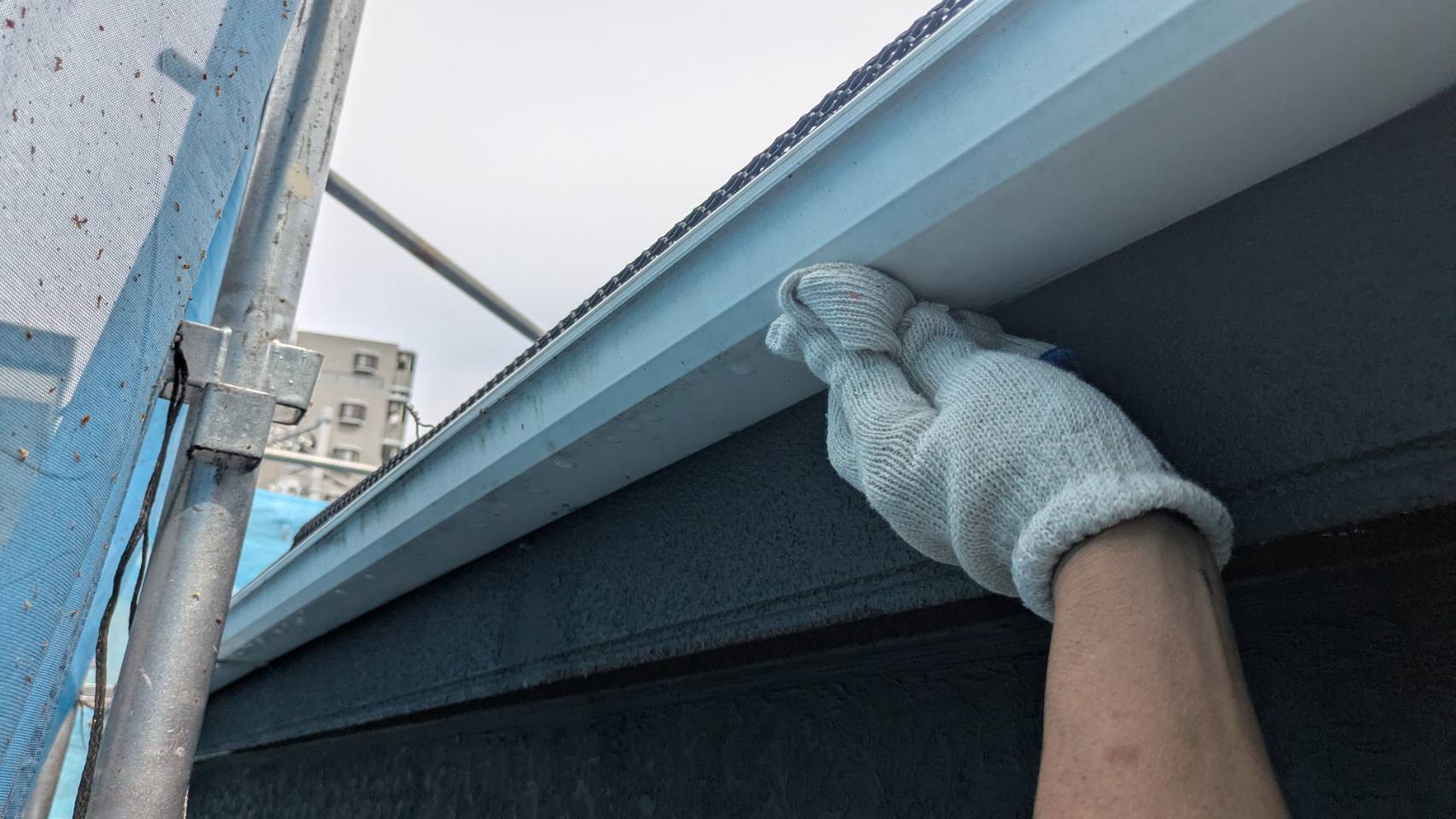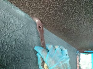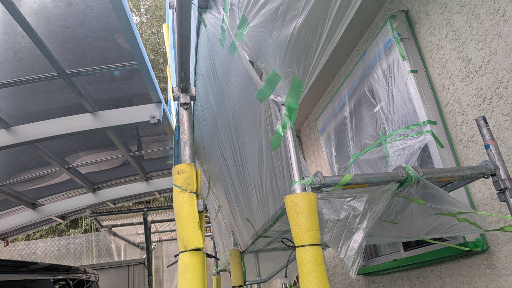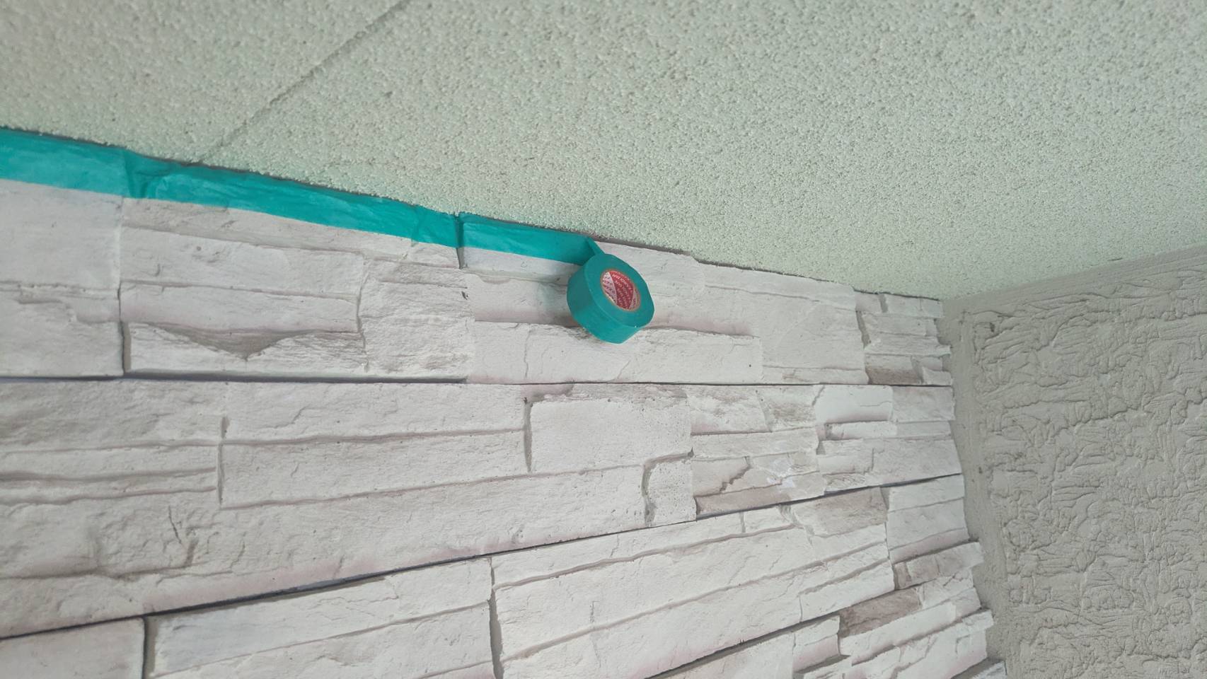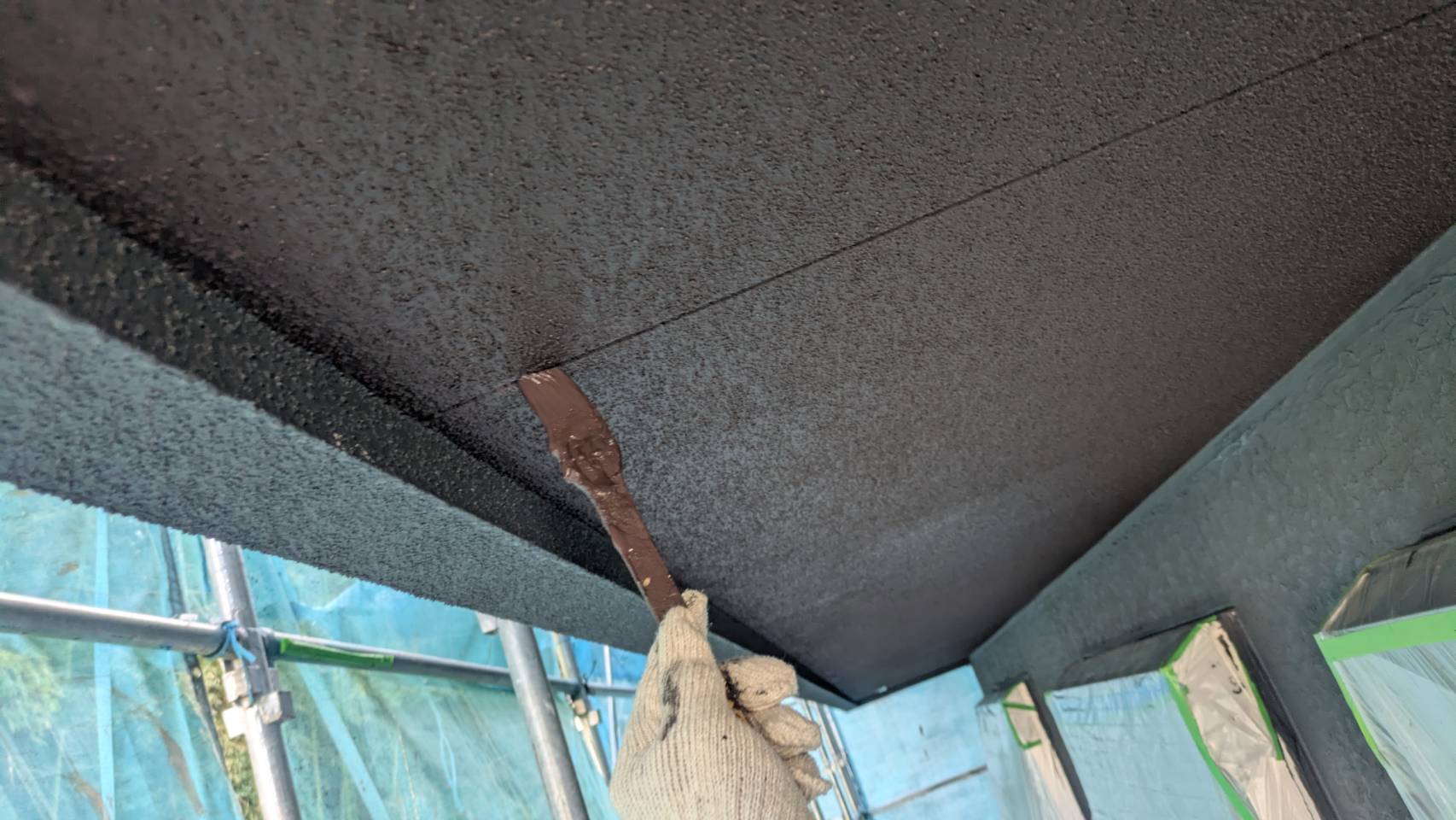 軒天塗装 上塗り2回目を施工。 養生を撤去して、見切り確認も。