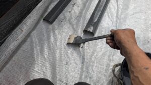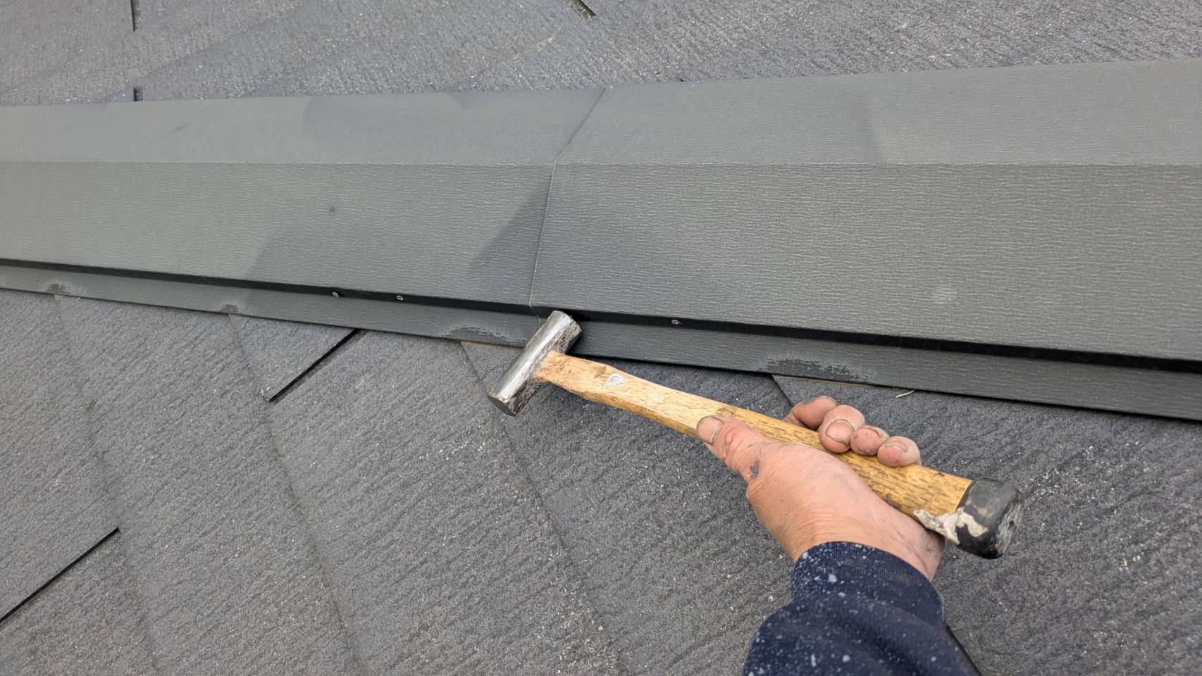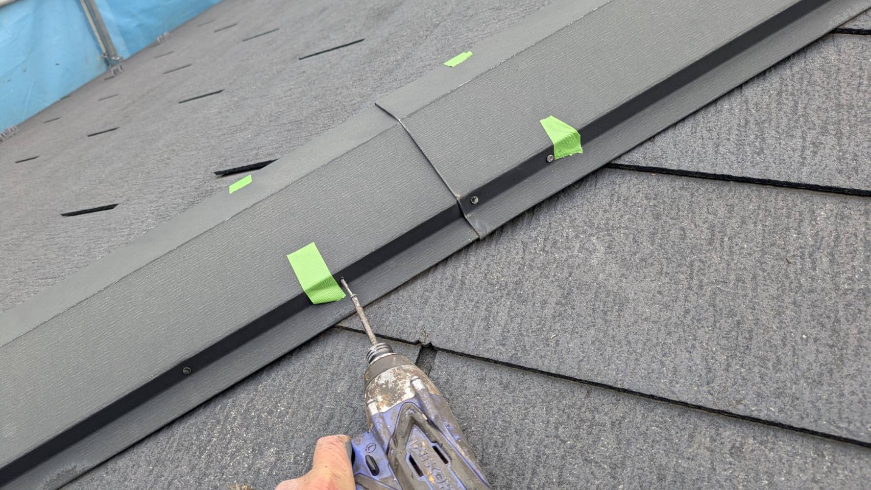 補強です。 棟押さえの釘打ち・ビス補強をしました。 台風で飛ばされることがあります。