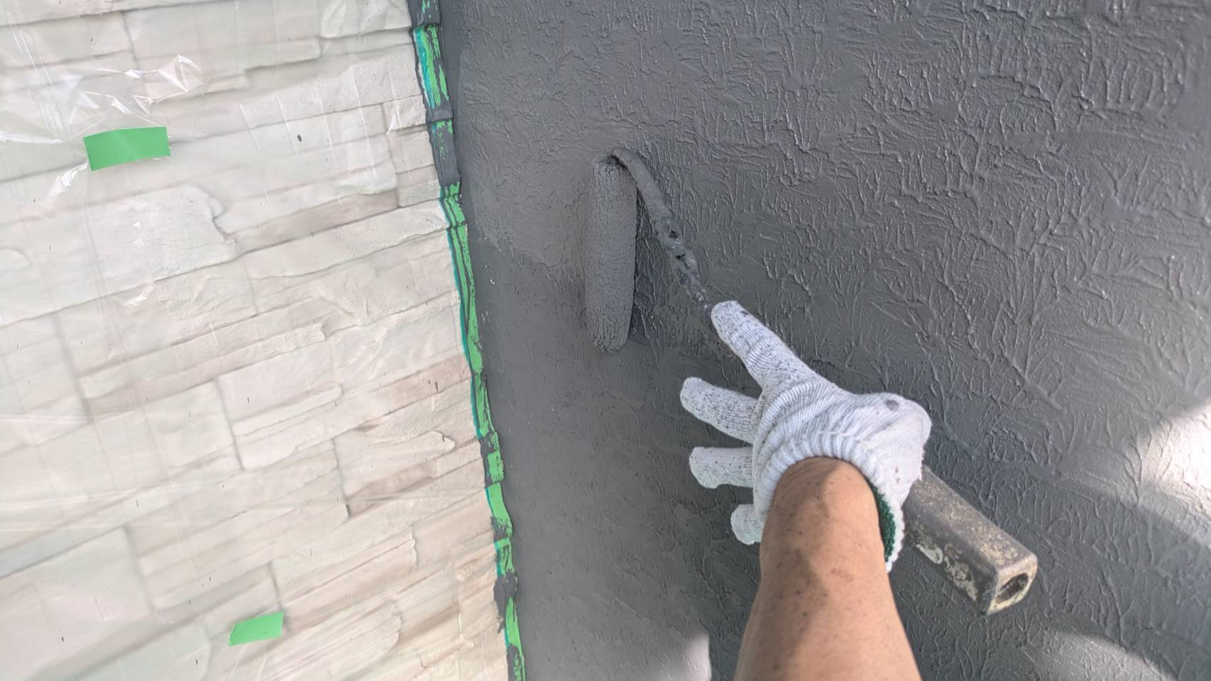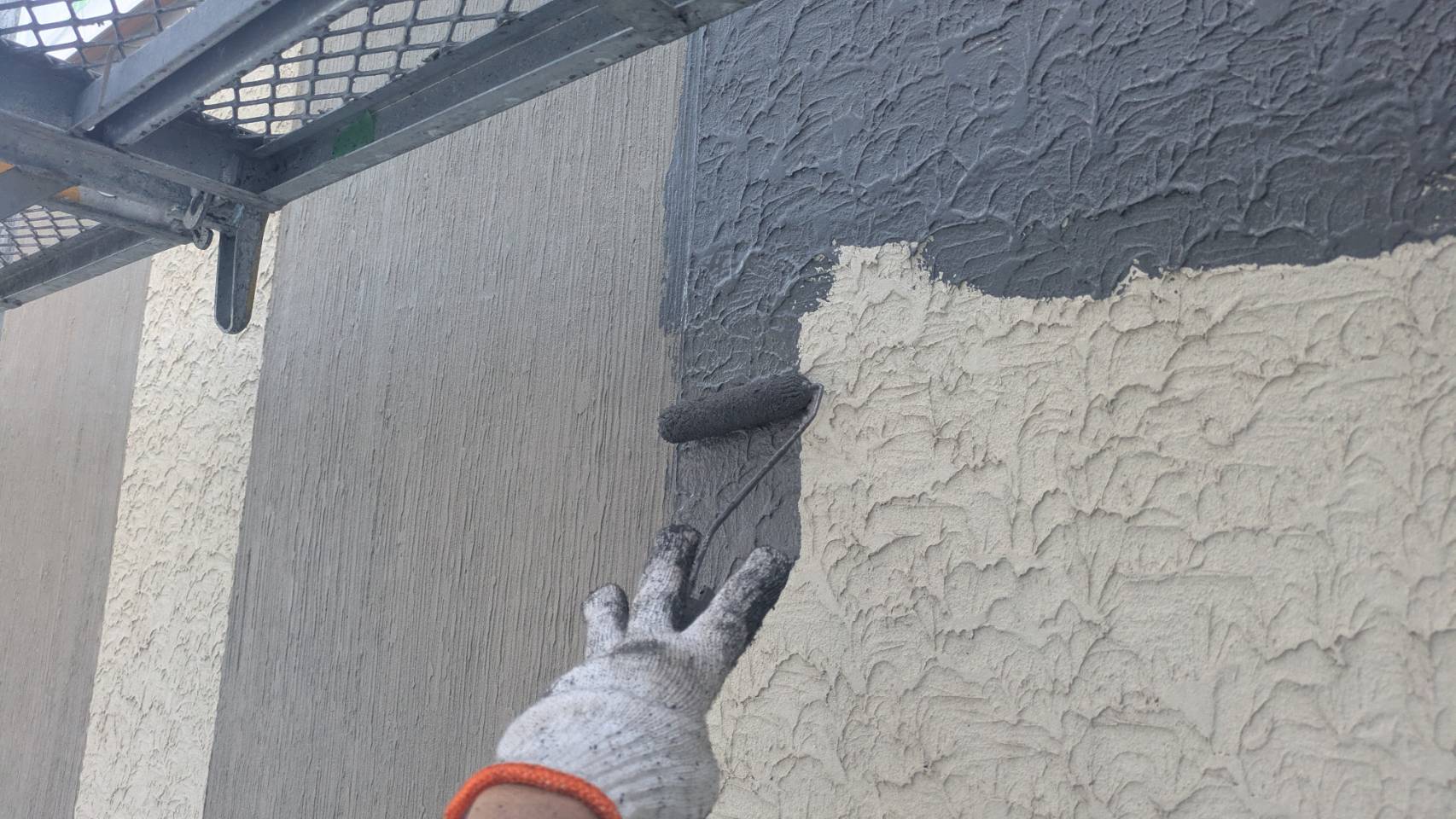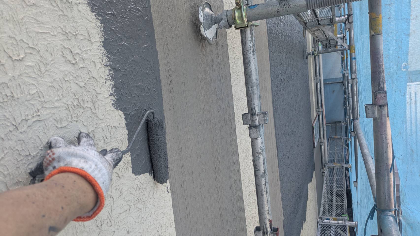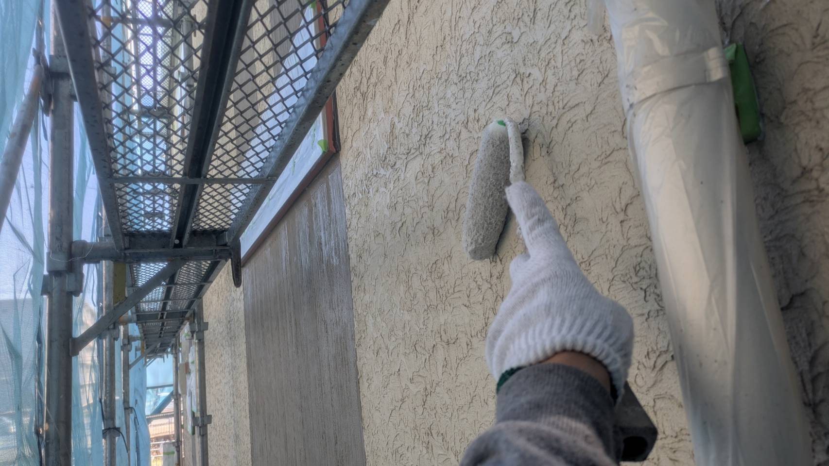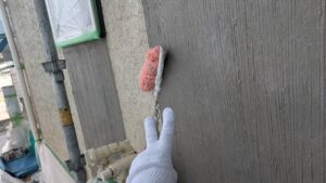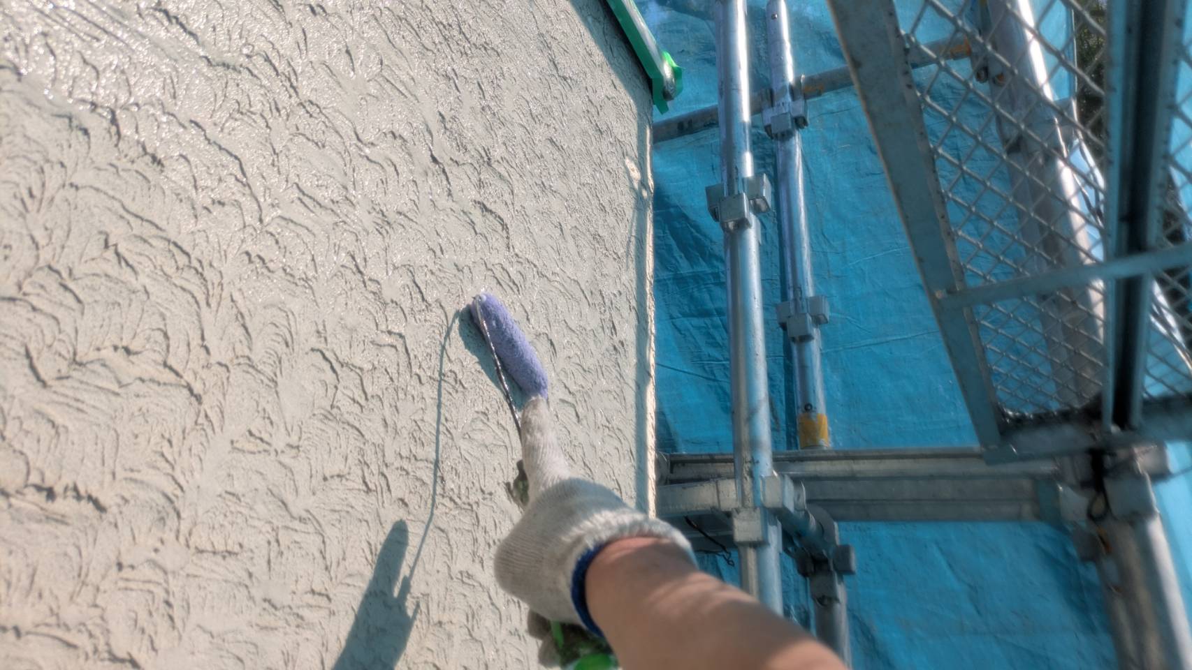 下塗り2回目です。 熱を反射する遮熱系下塗り材。 下地を安定した状態に仕上げます。