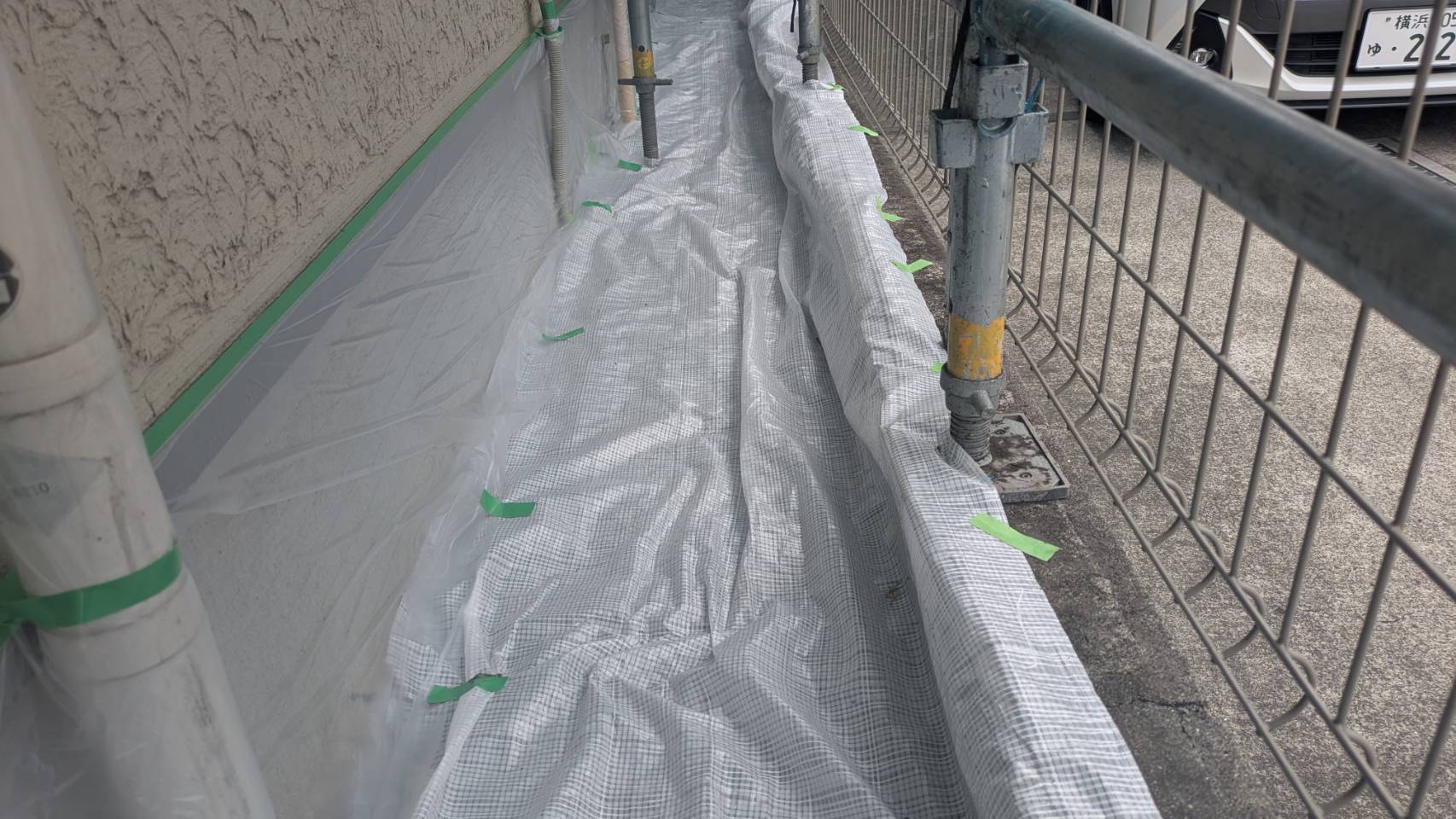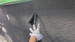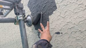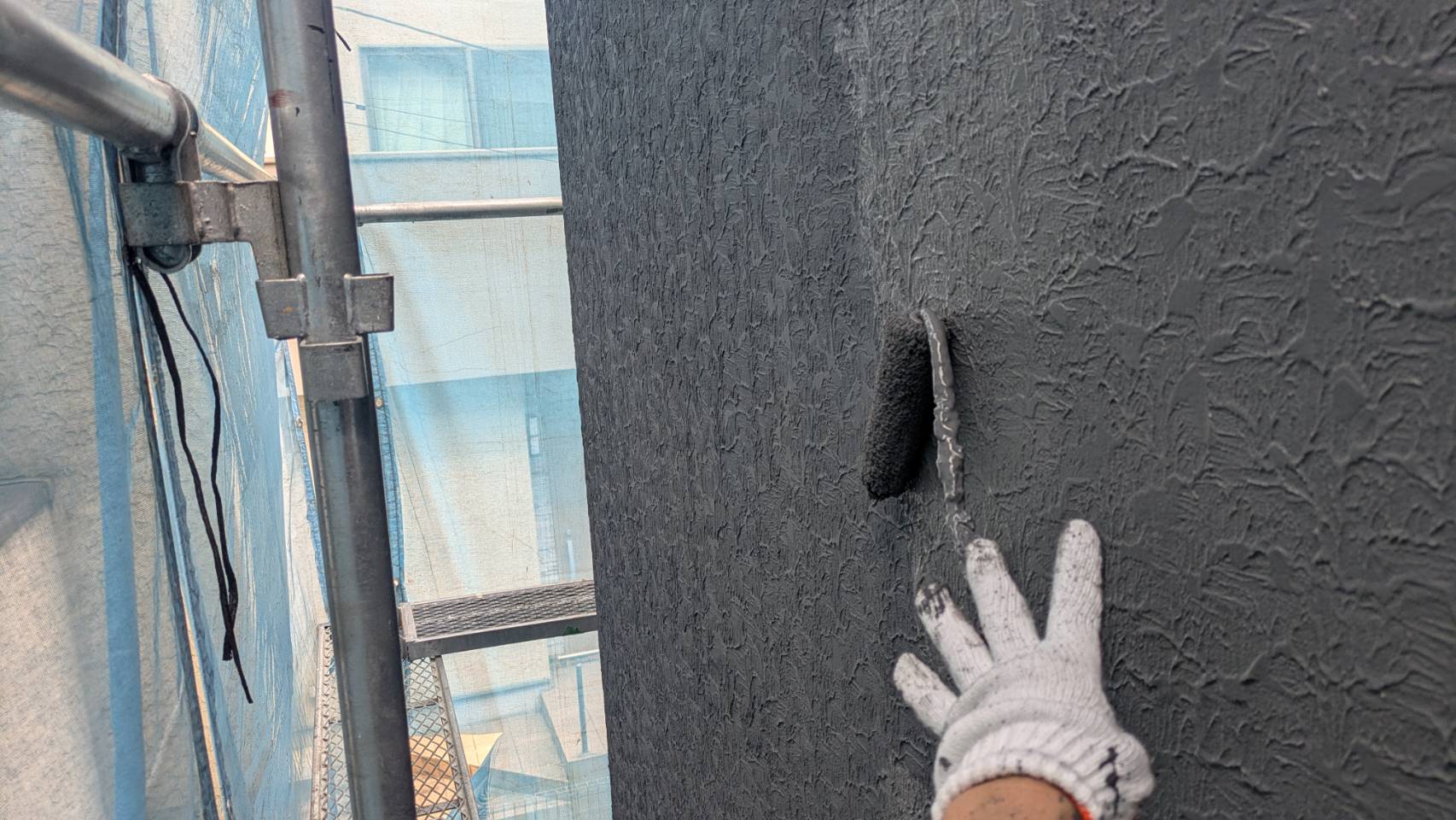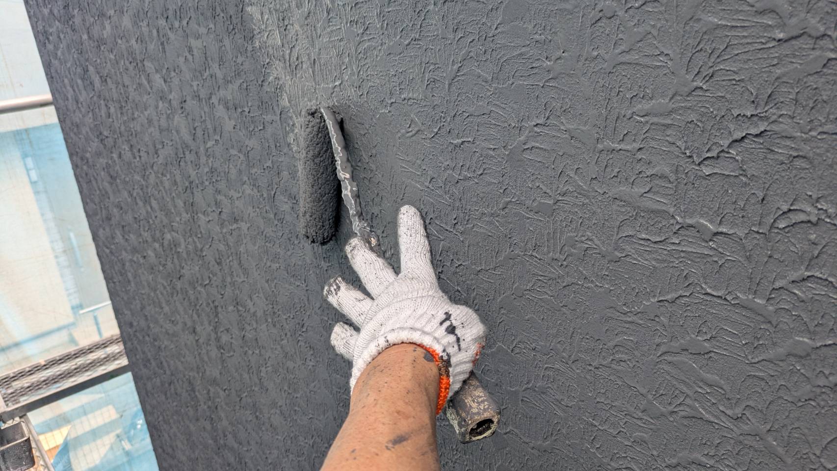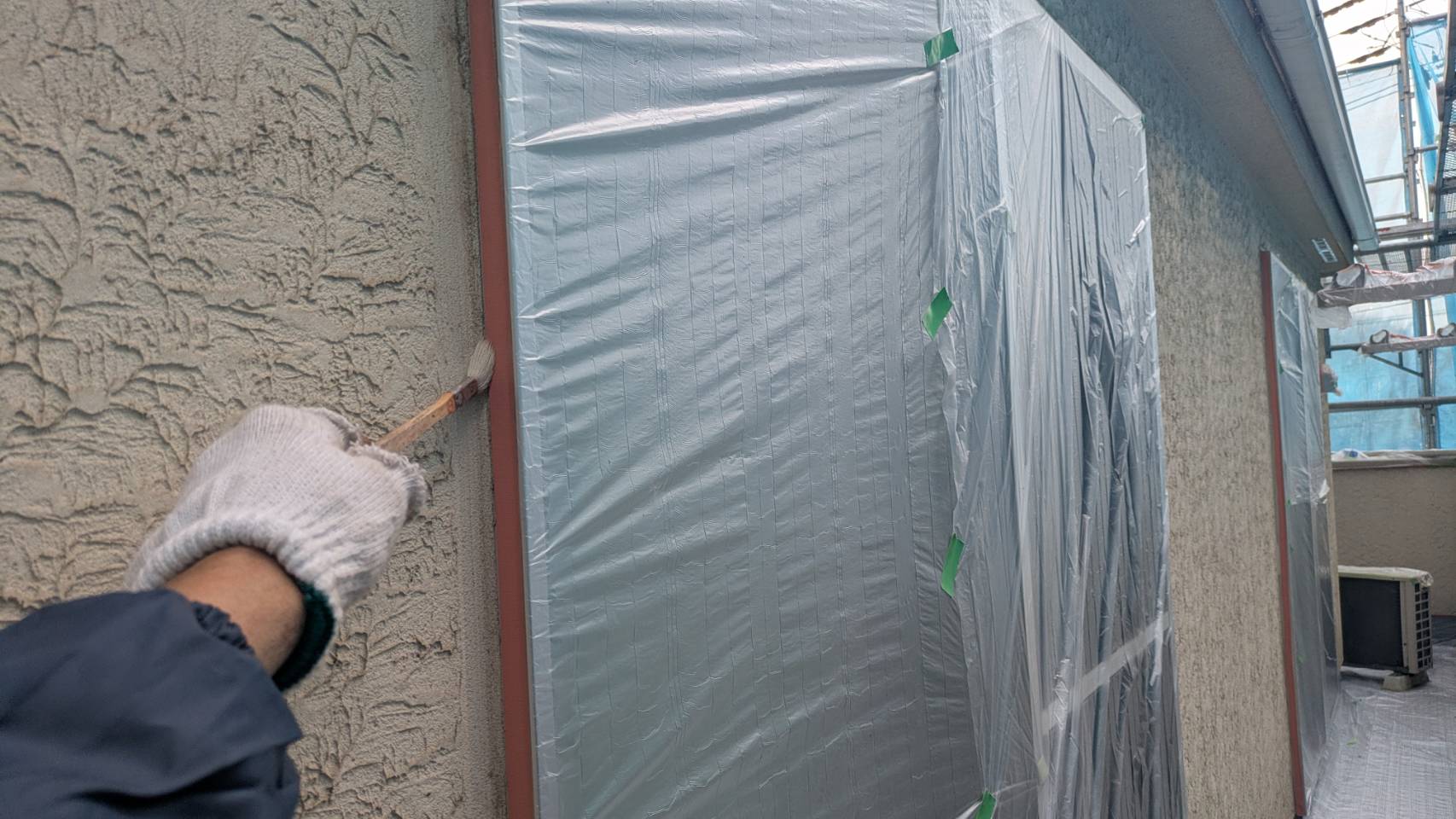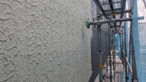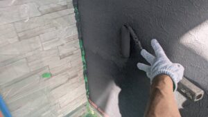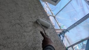 下塗り2回目です。 熱を反射する遮熱系下塗り材。 下地を安定した状態に仕上げます。