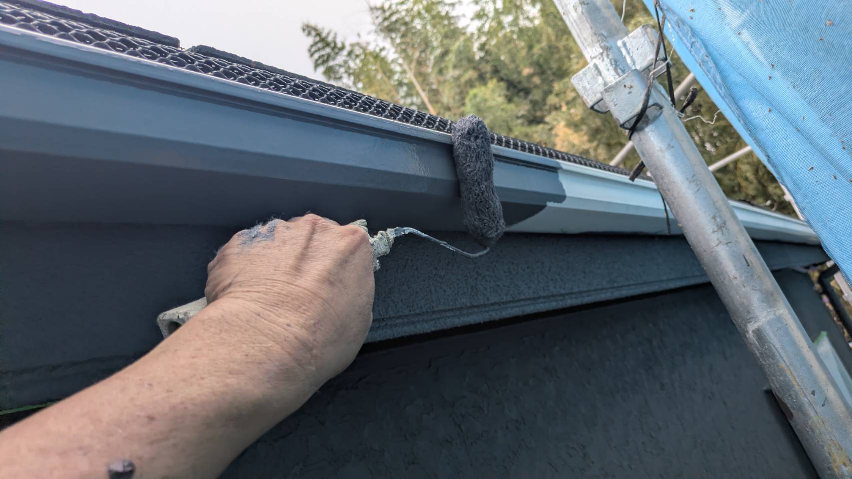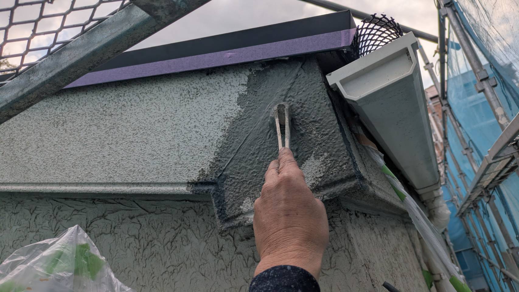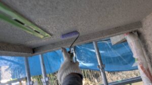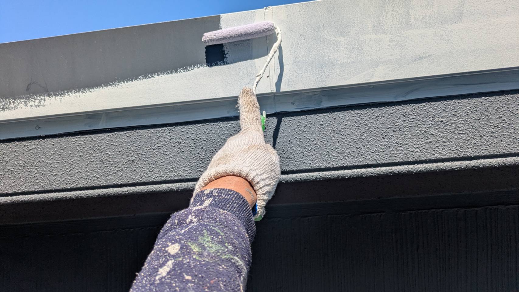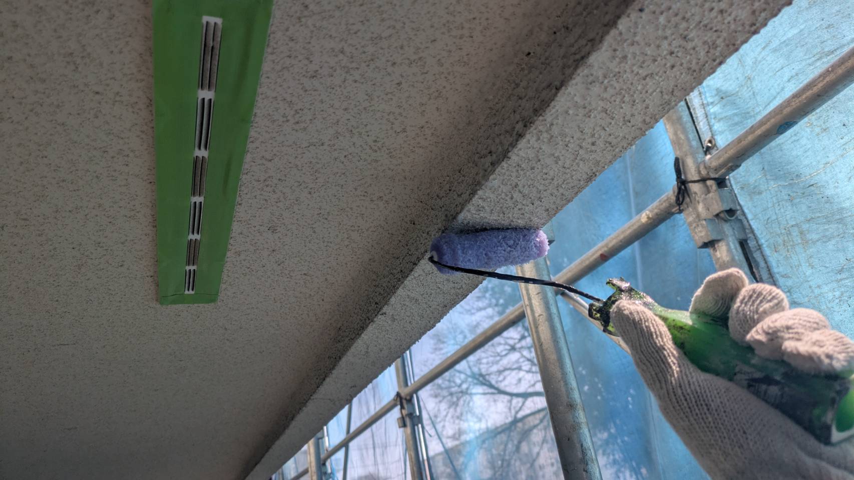 軒天 全体はローラー施工。 色分け部のハケ見切りの様子です。
