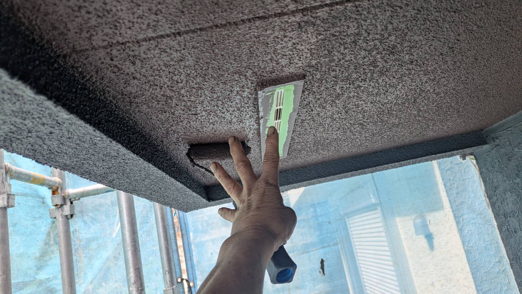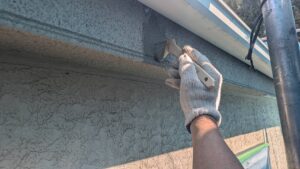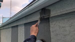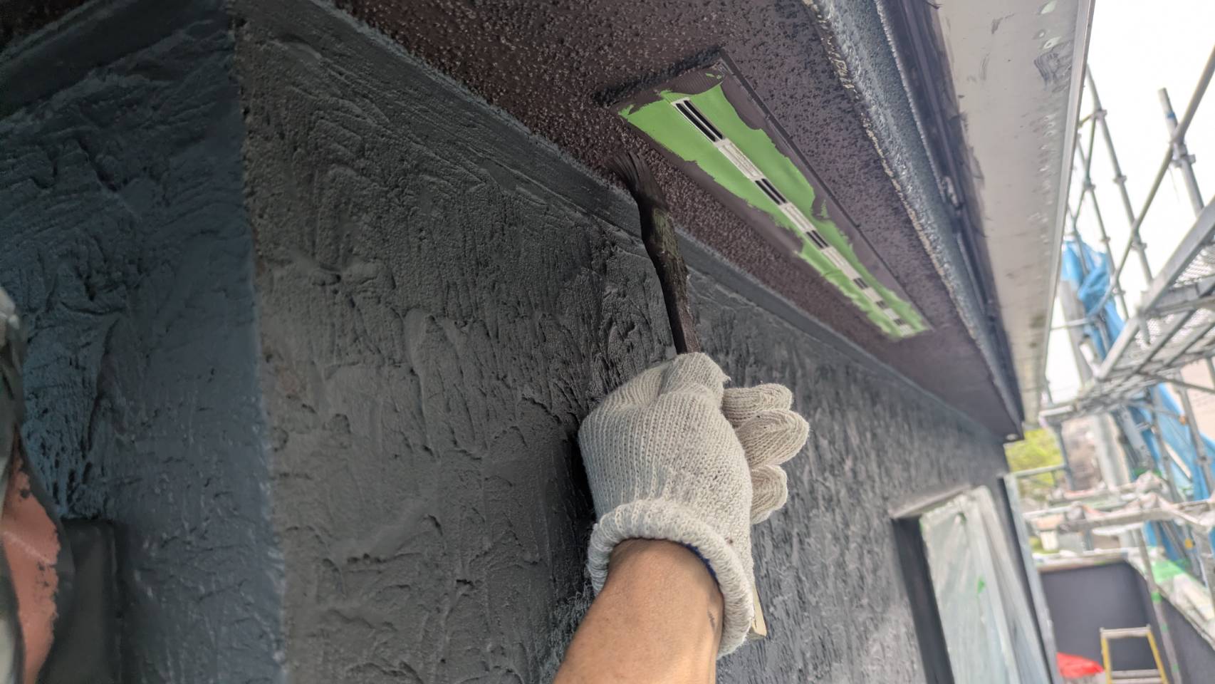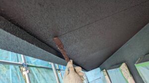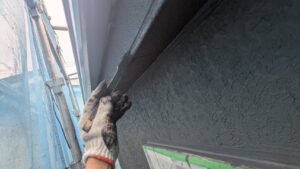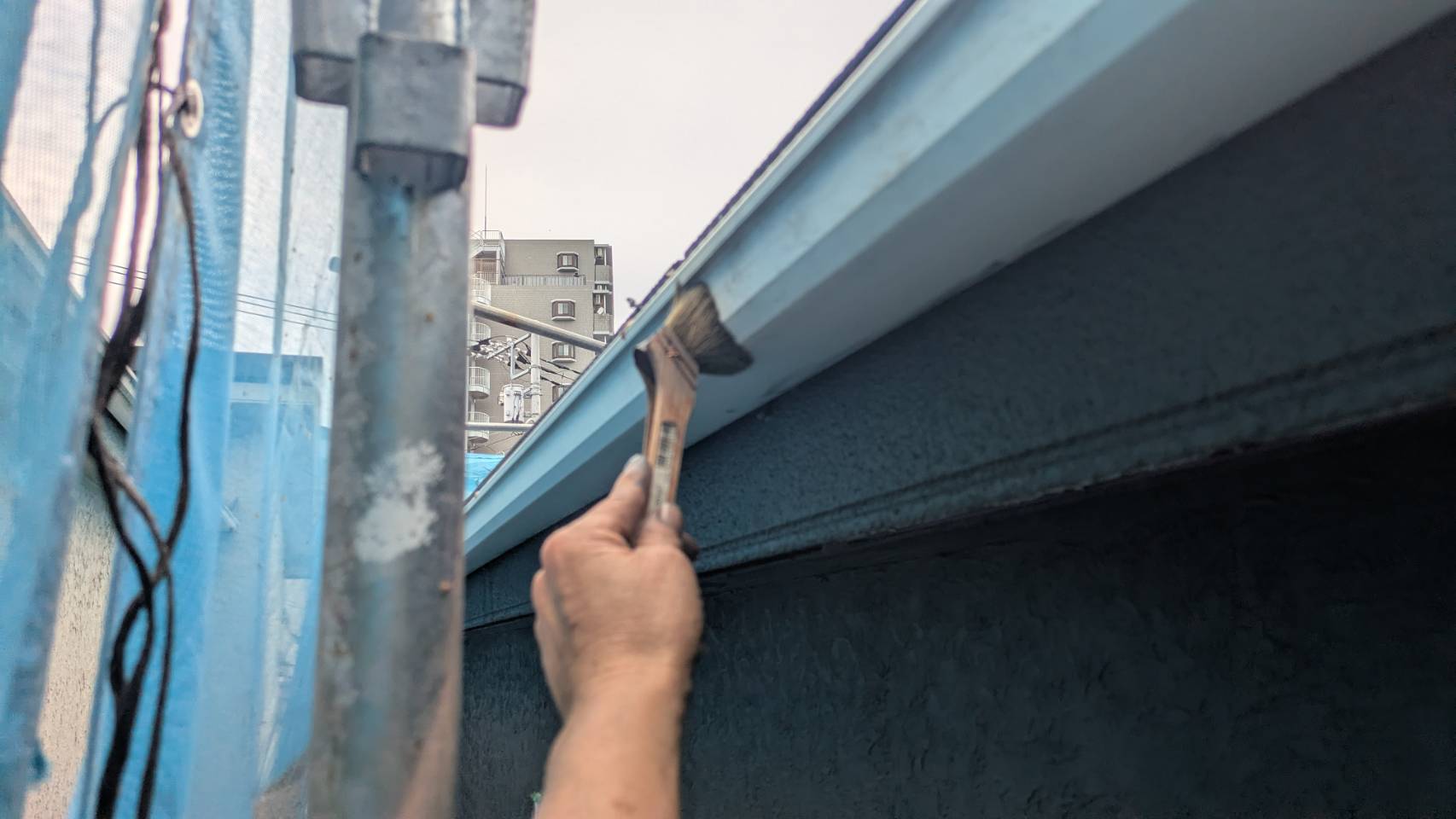 軒天 全体はローラー施工。 色分け部のハケ見切りの様子です。