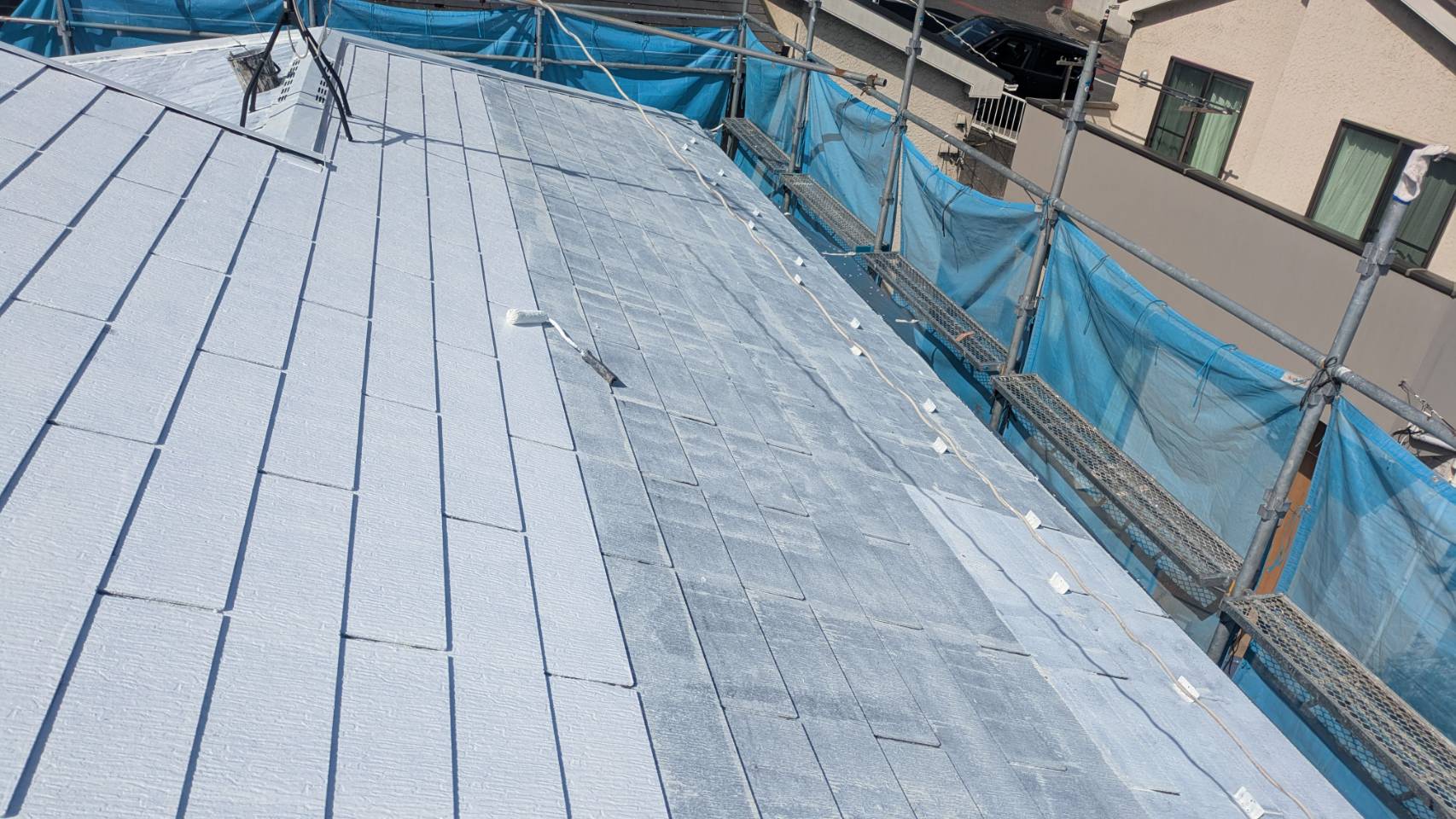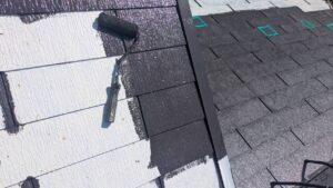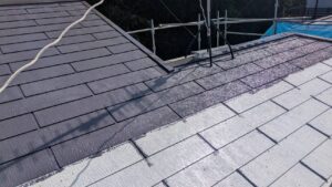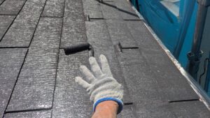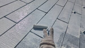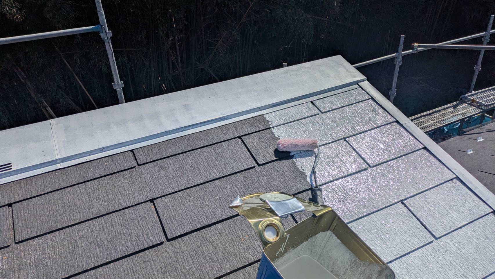 スレート屋根塗装 1回目 浸透タイプ 屋根材を強固にする特性があります。