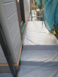木製サッシ・ガラス・玄関タイルなど 養生を進めました。