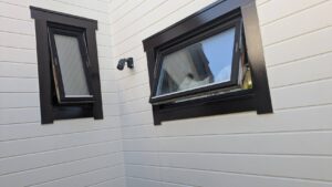 窓を開けて、側面塗装・防腐処理。 湿気・雨水対策。
