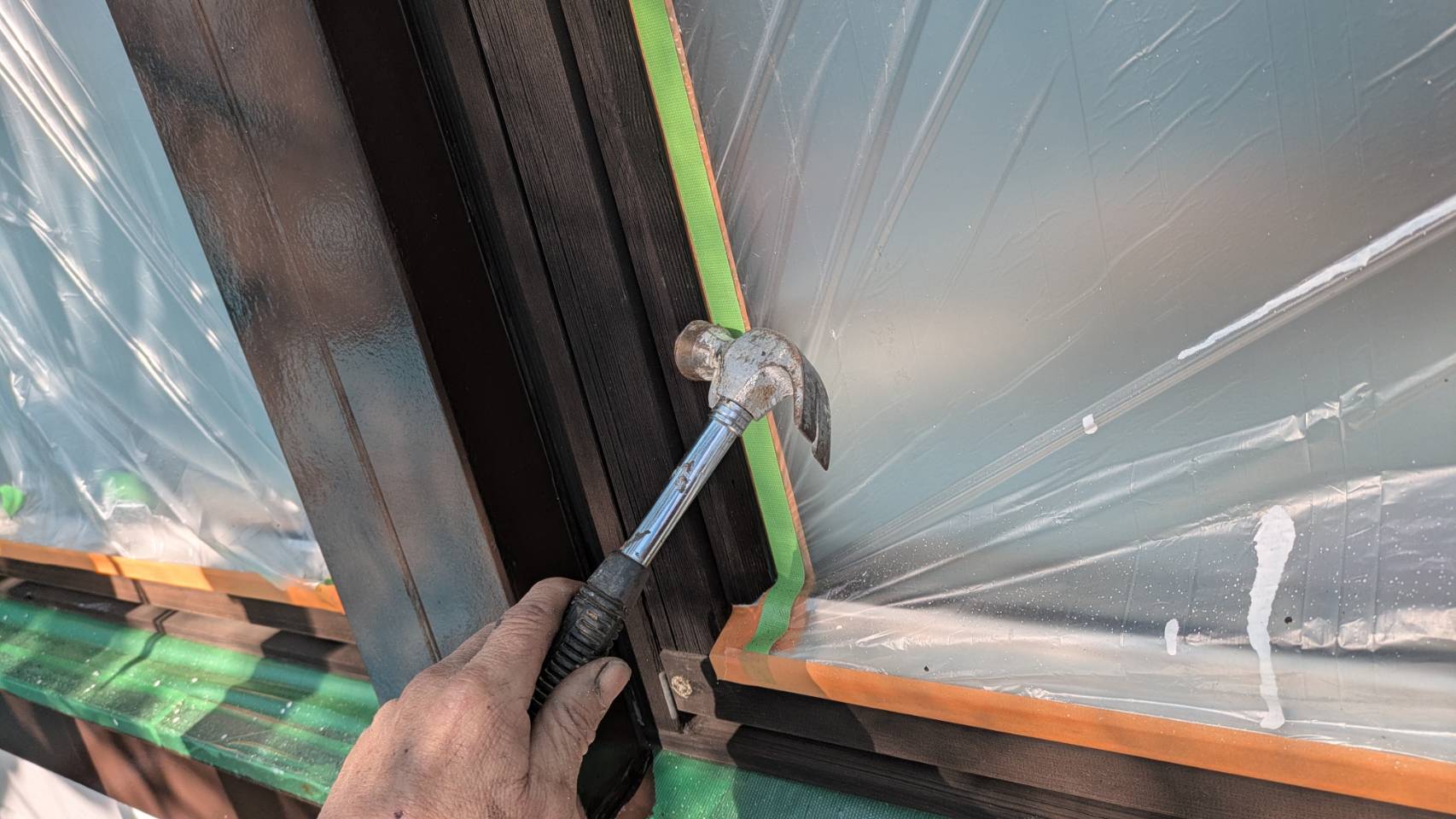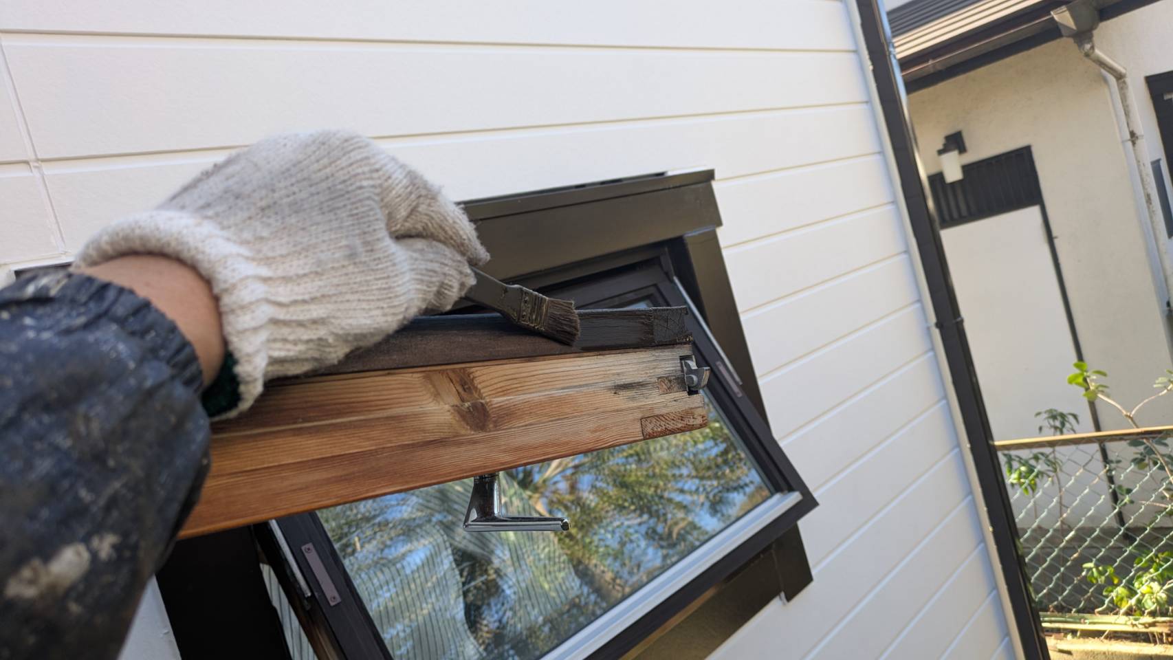 窓を開けて、側面塗装・防腐処理。 湿気・雨水対策。