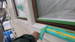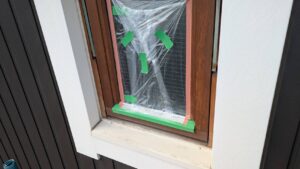 窓の養生を仕上げました。 そして、黄色のマスキングテープ。 窓枠廻りの防水シール処理の準備です。