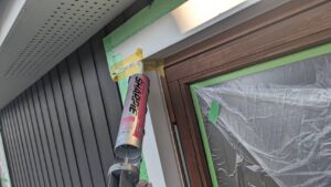 窓枠とサイディング壁  取り合い部に防水シール材を注入します。