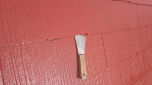 シール材を注入したら、必ずヘラで押さえます。  サイディング壁 両側面に確実に密着するようにします。