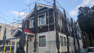 スウェーデンハウス外壁塗装を専門工法で施工中。素材の特性を無視した塗装では不具合につながるため、建物に合わせた下地処理と塗装工程を採用しています。 施工進捗が分かるように解説させて頂きます。