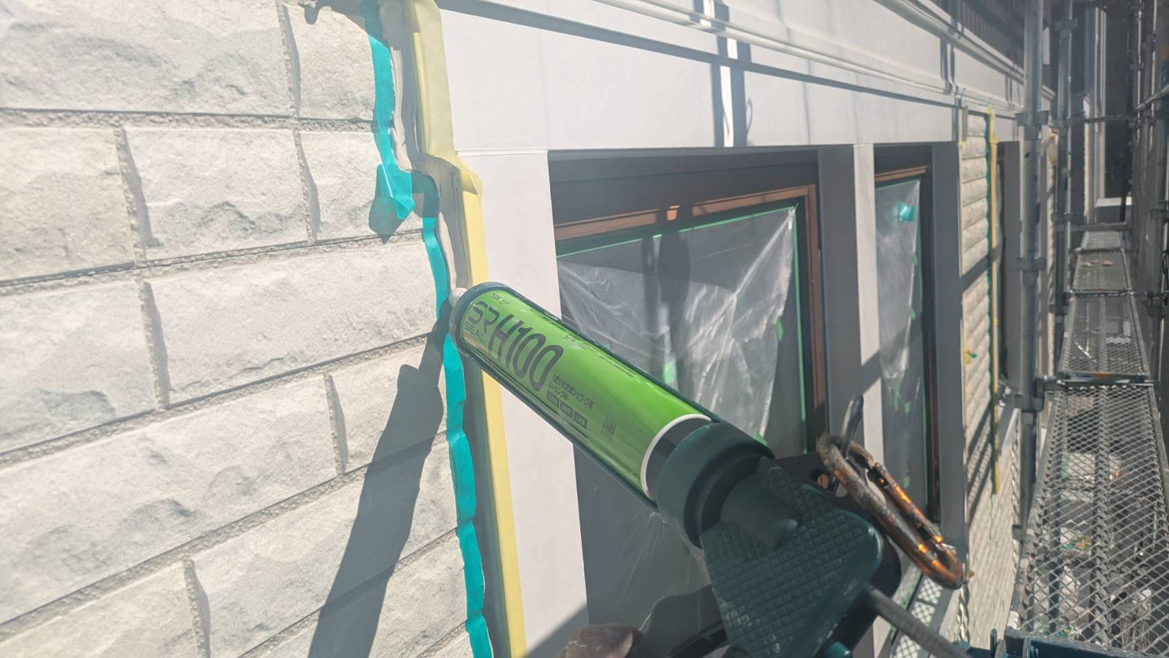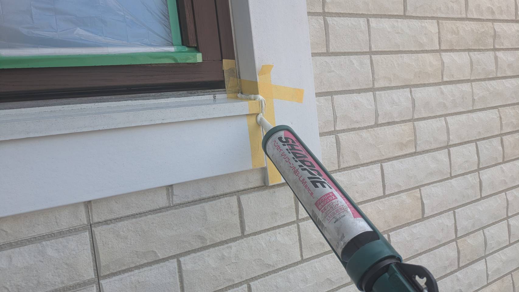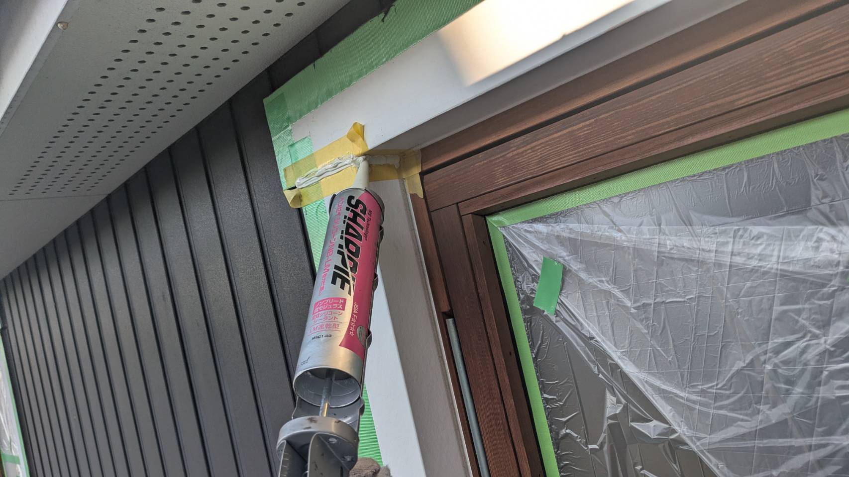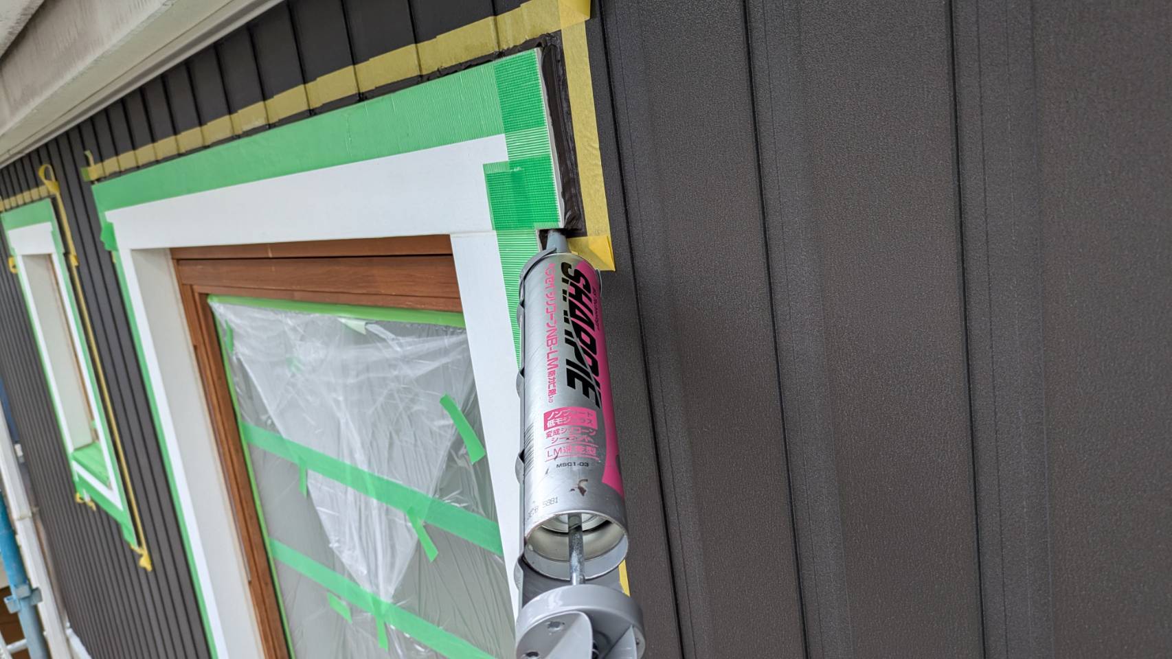 窓の養生を仕上げました。 そして、黄色のマスキングテープ。 窓枠廻りの防水シール処理の準備です。
