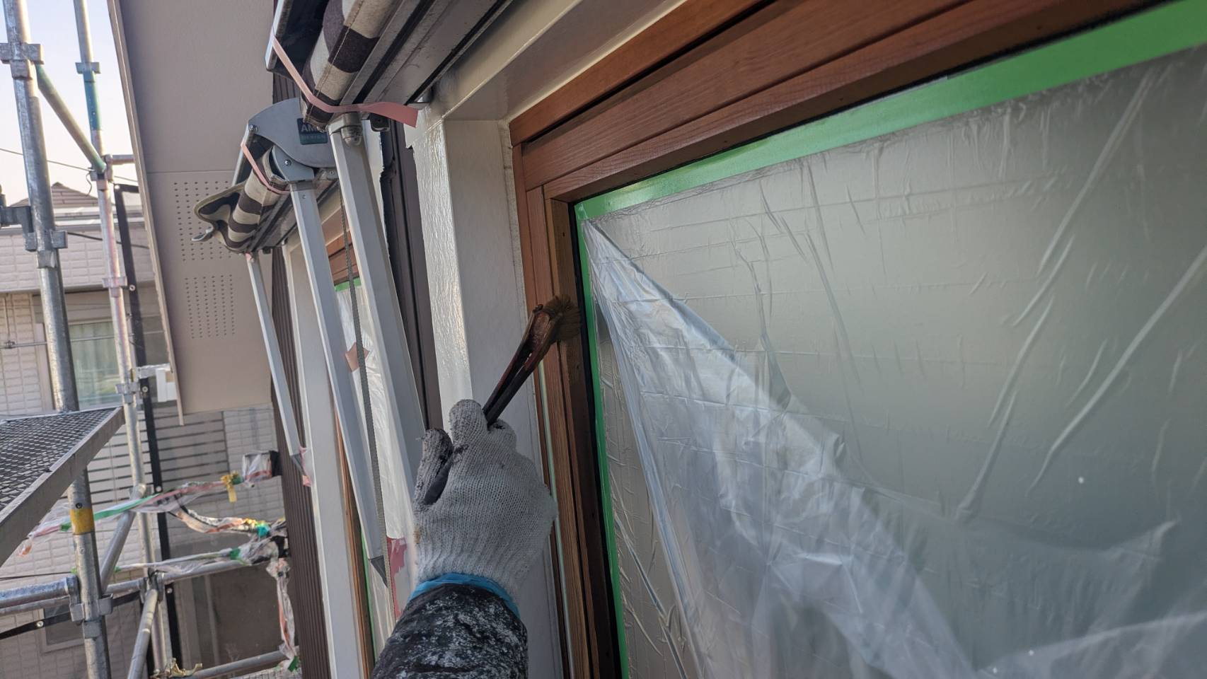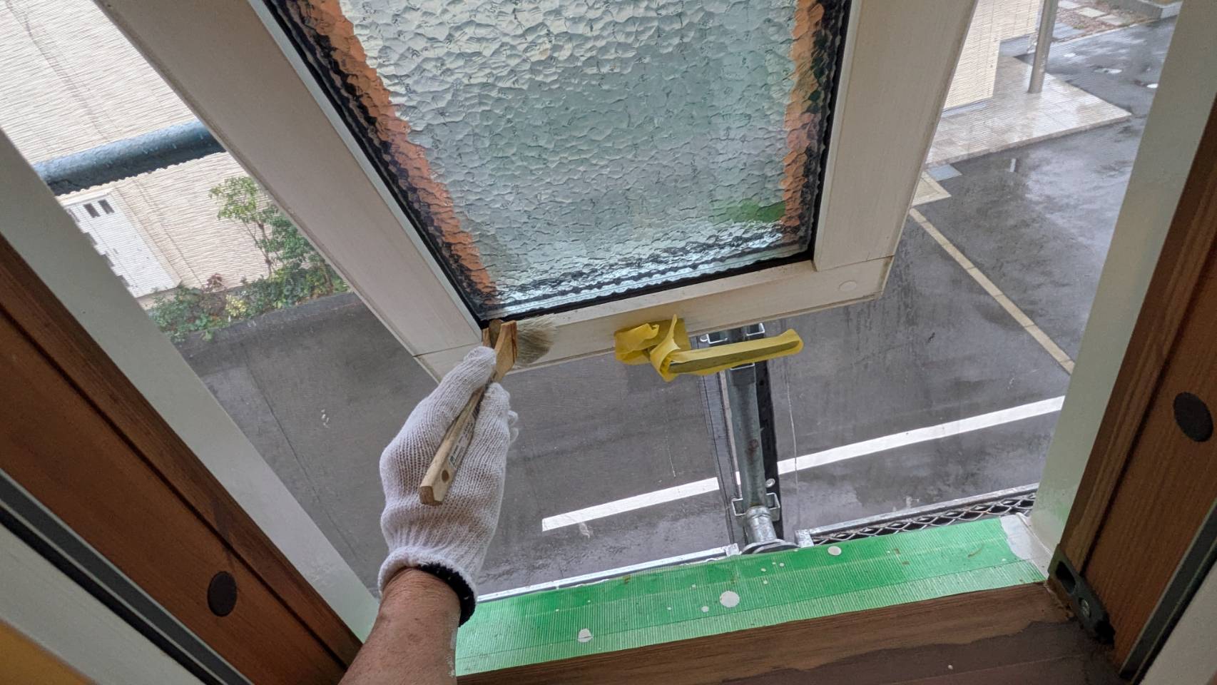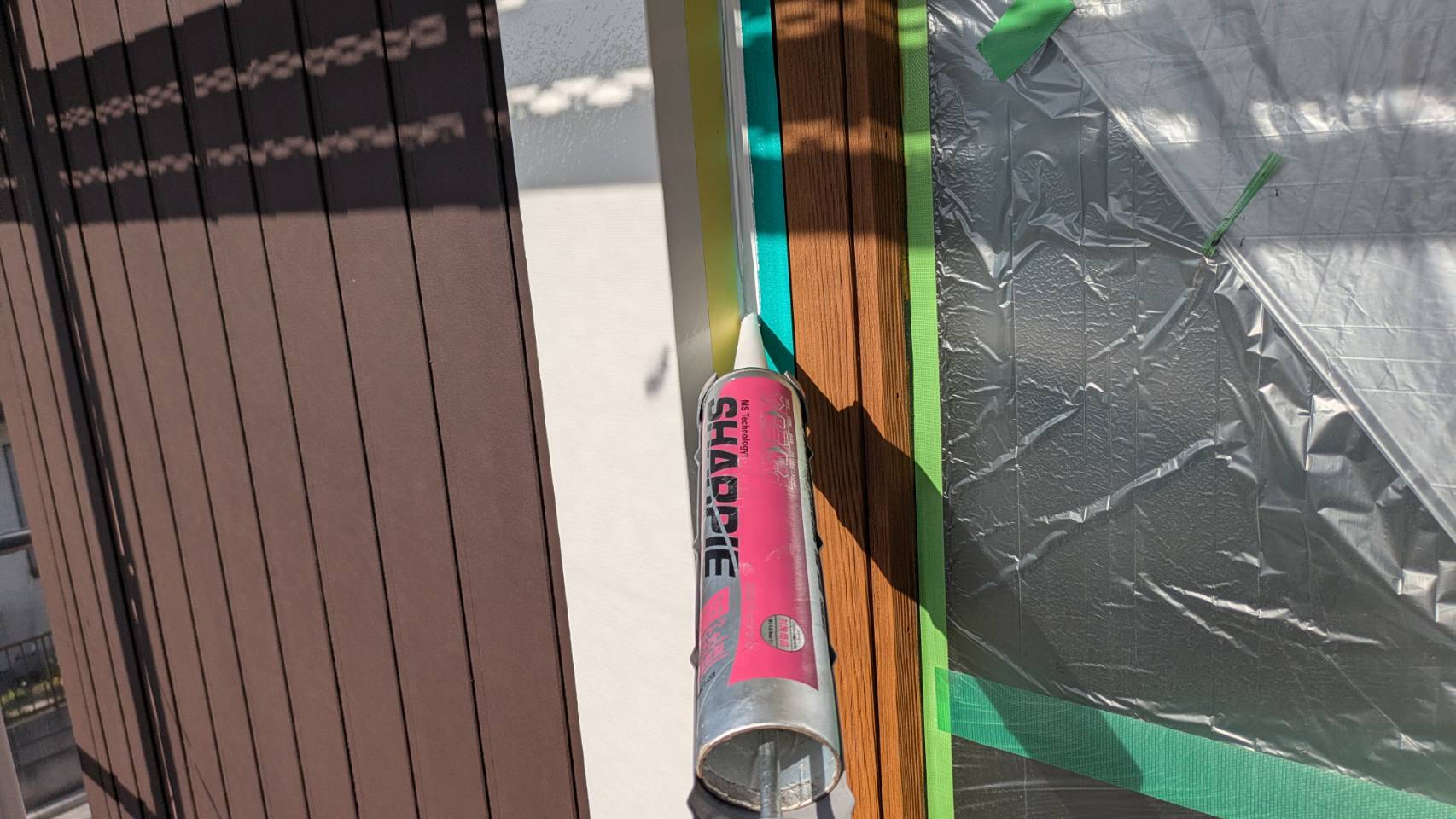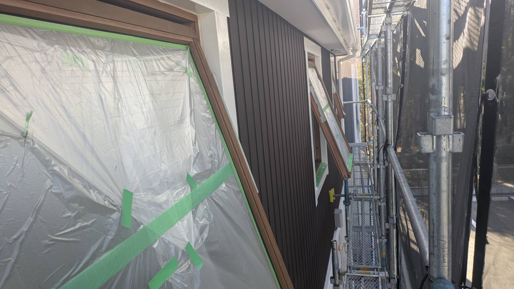 窓の養生を仕上げました。 そして、黄色のマスキングテープ。 窓枠廻りの防水シール処理の準備です。