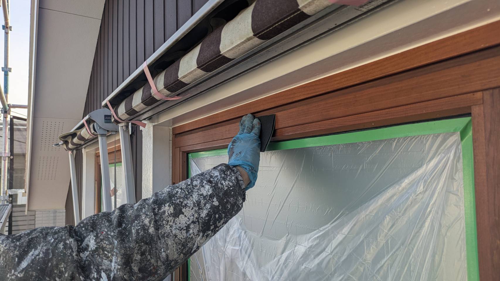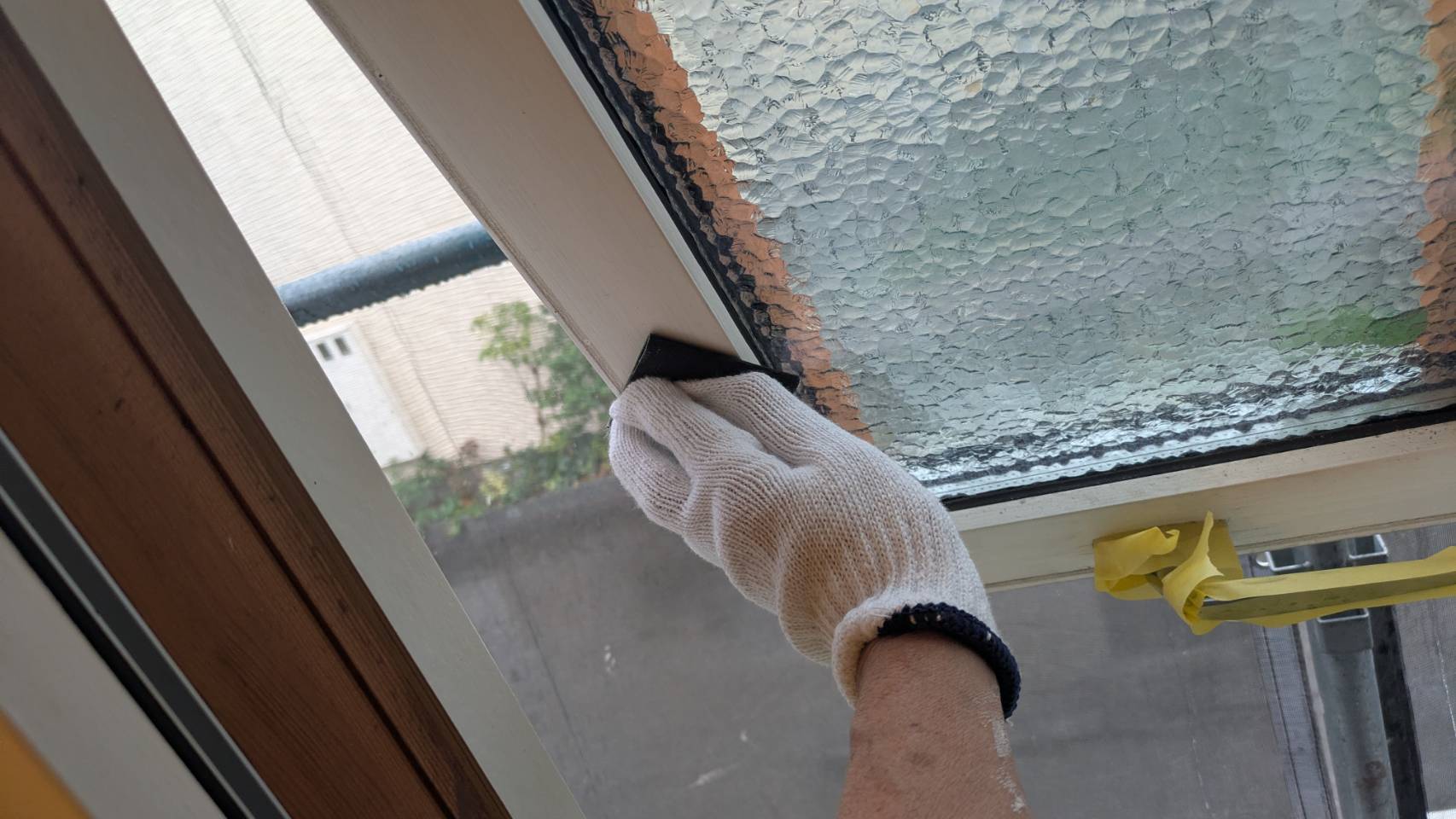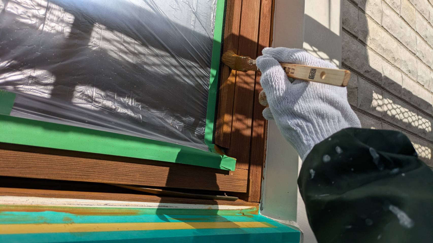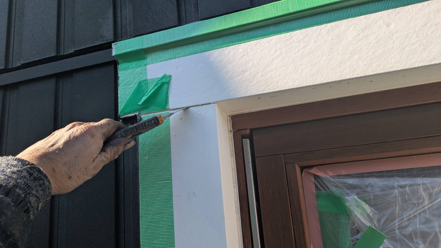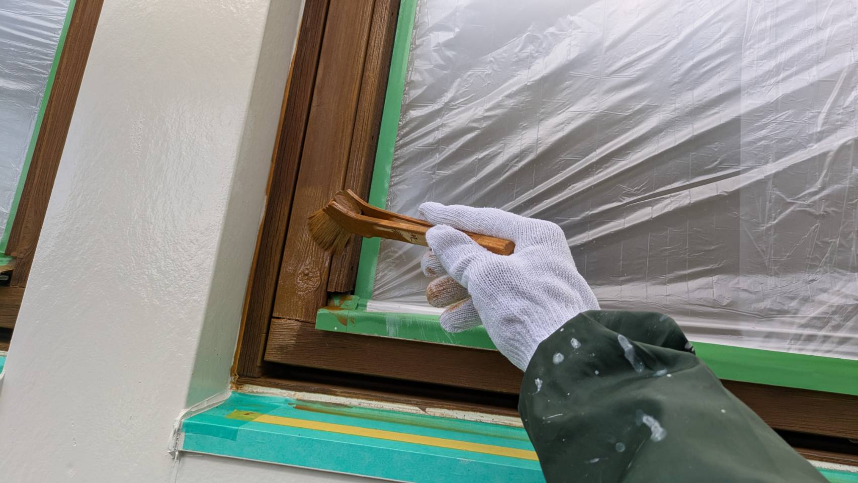 窓の養生を仕上げました。 そして、黄色のマスキングテープ。 窓枠廻りの防水シール処理の準備です。