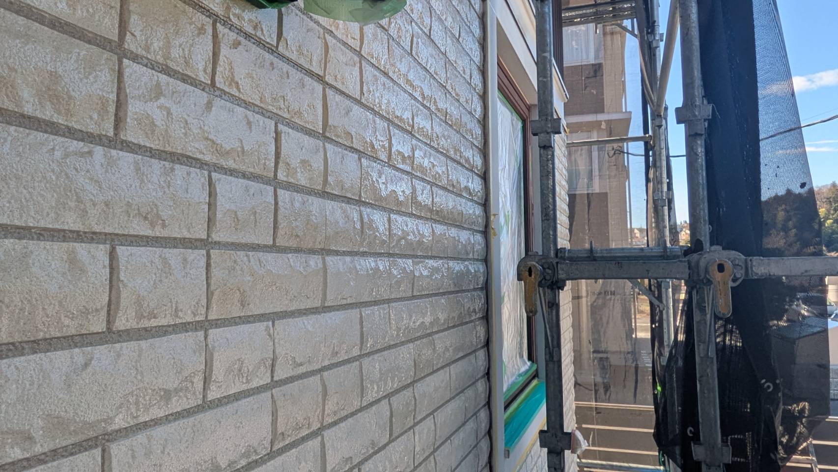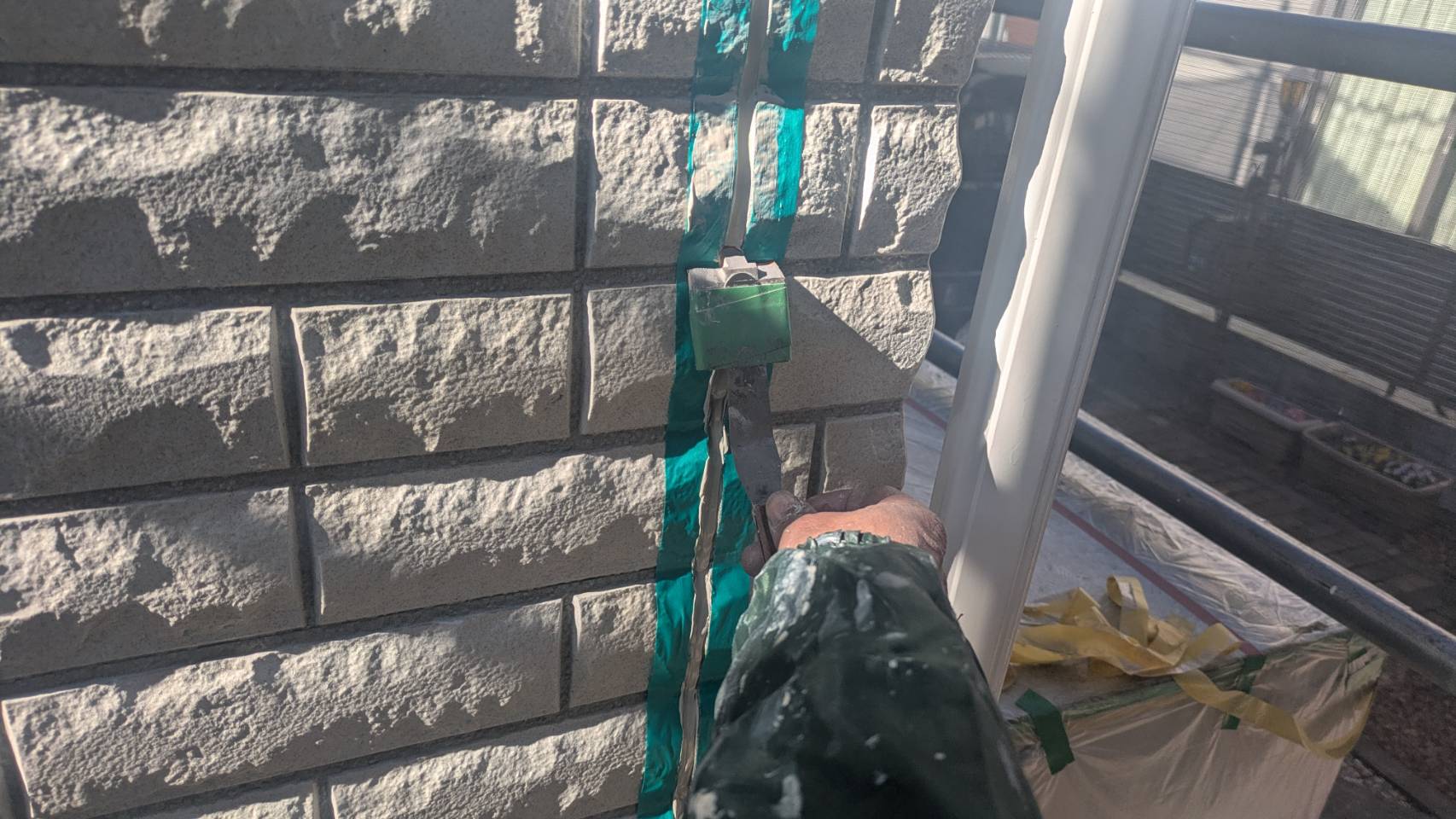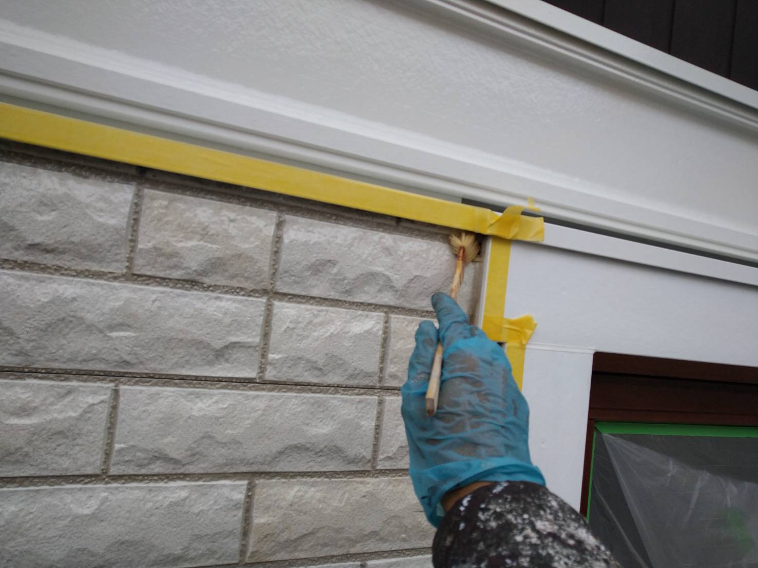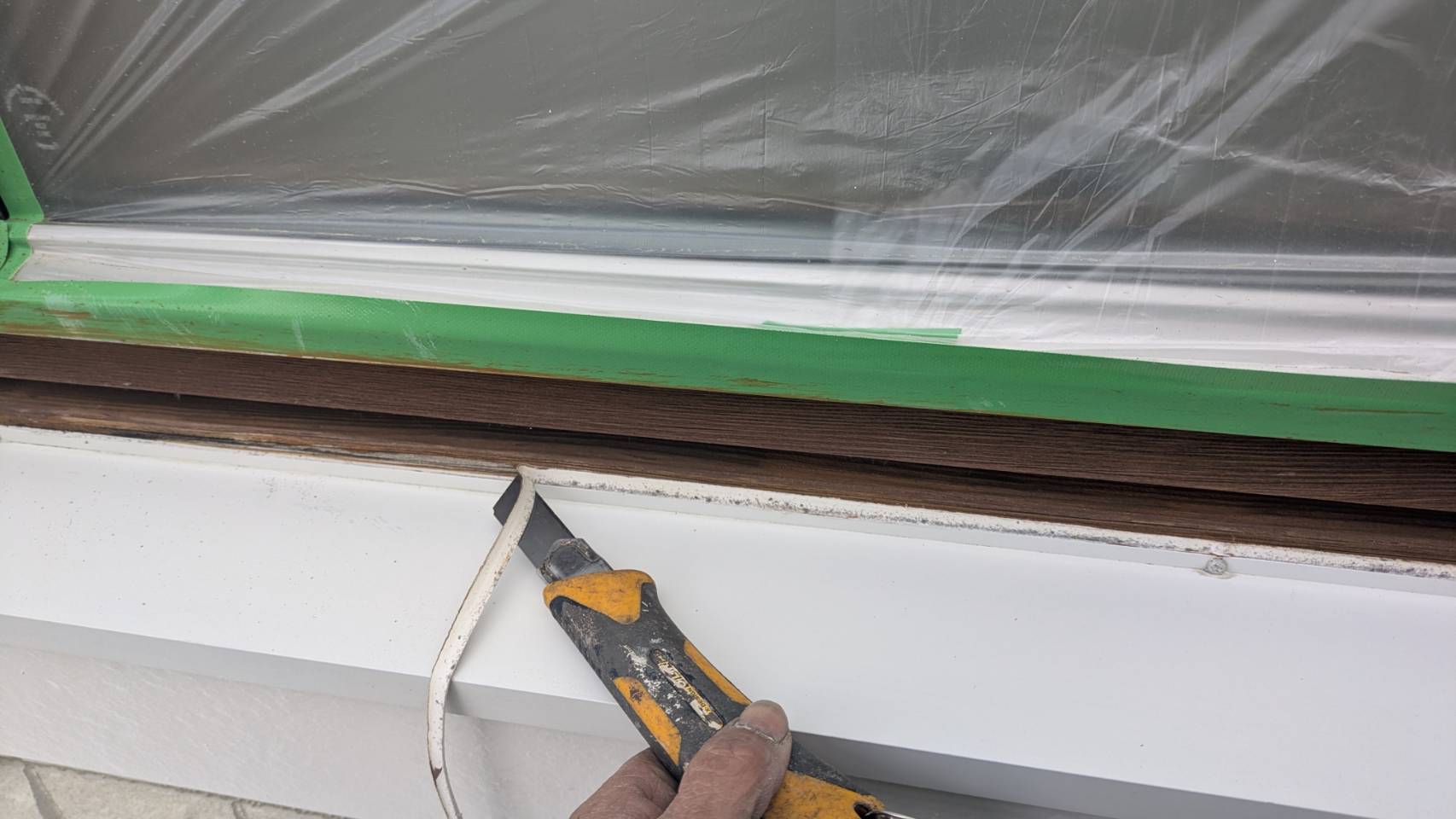 窓の養生を仕上げました。 そして、黄色のマスキングテープ。 窓枠廻りの防水シール処理の準備です。