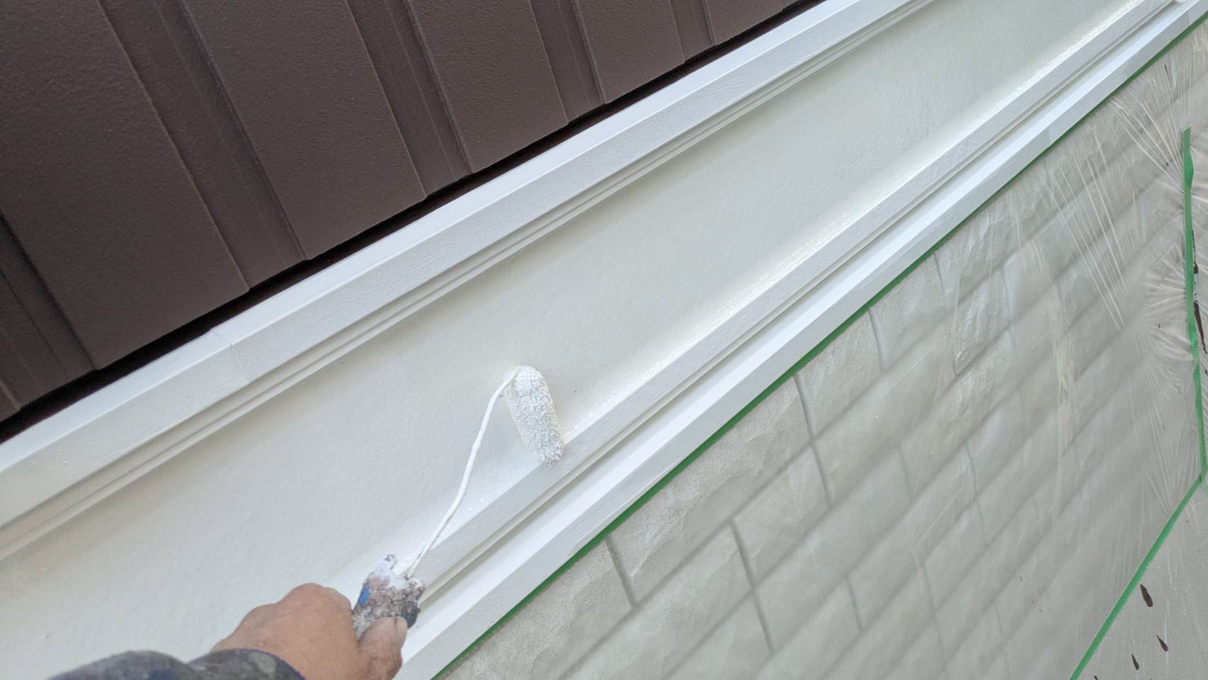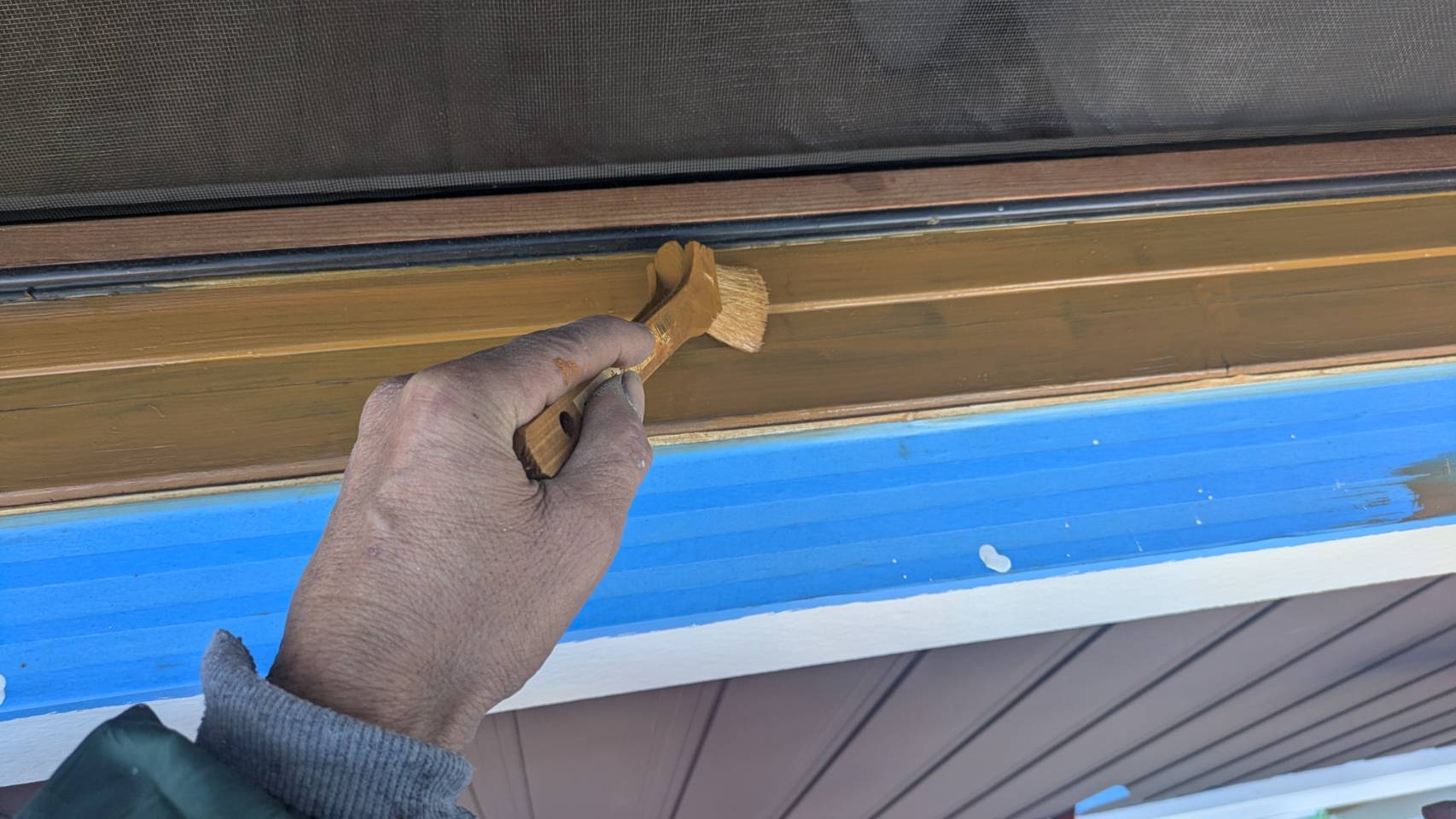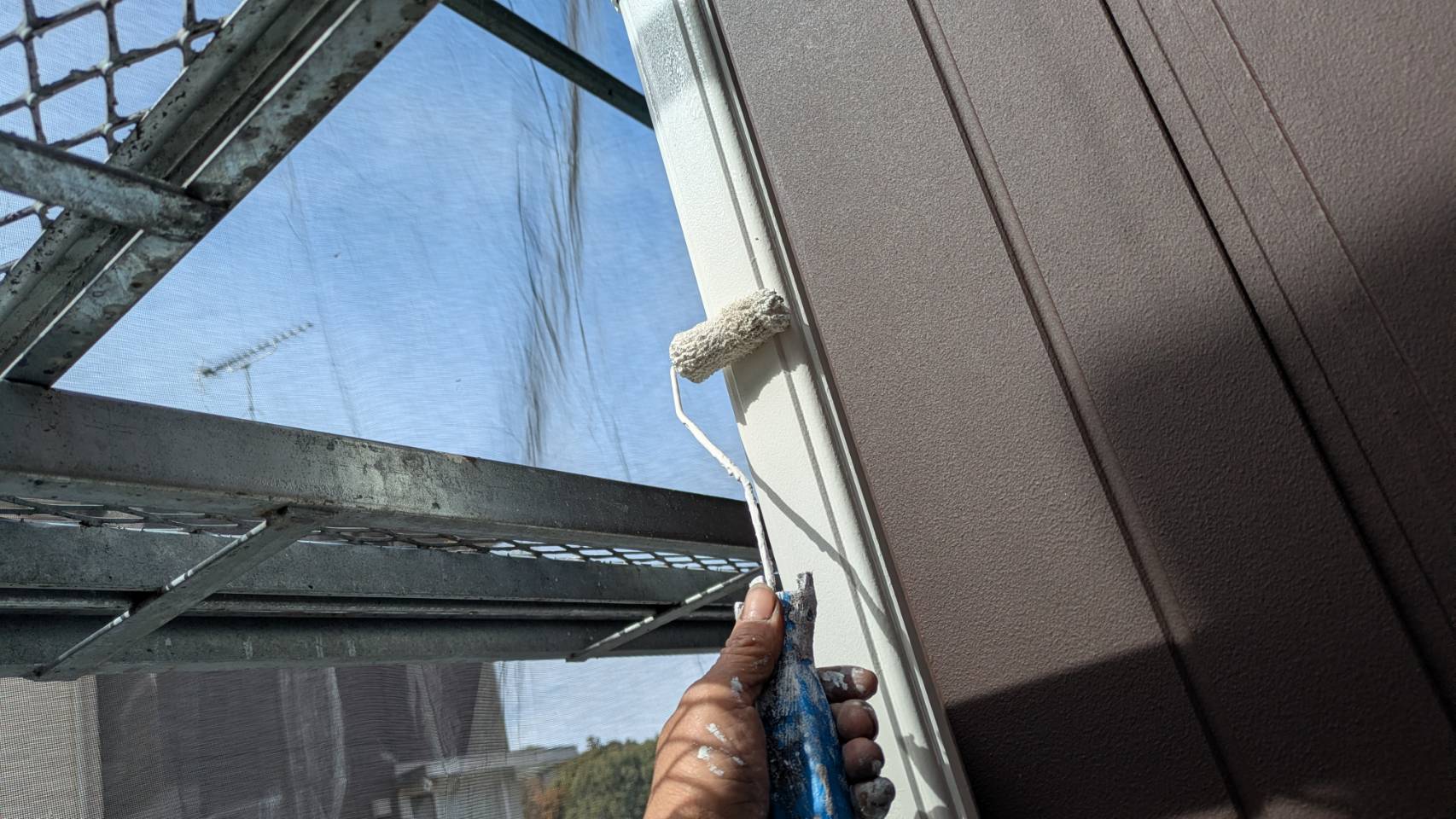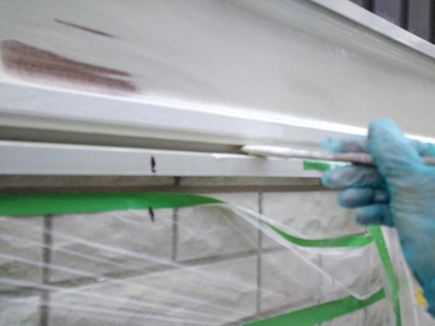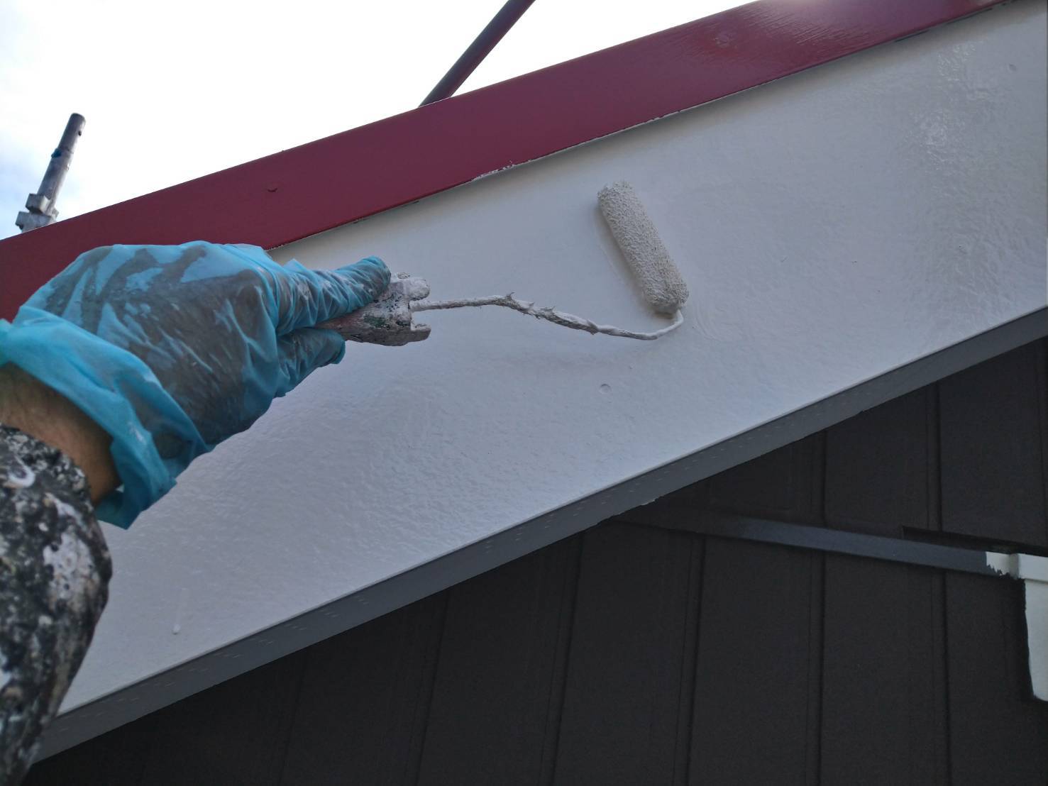 破風板塗装 狭いすき間はハケ塗り。 全体はローラー塗り(膜厚を均一に塗りやすいローラーを使用します)