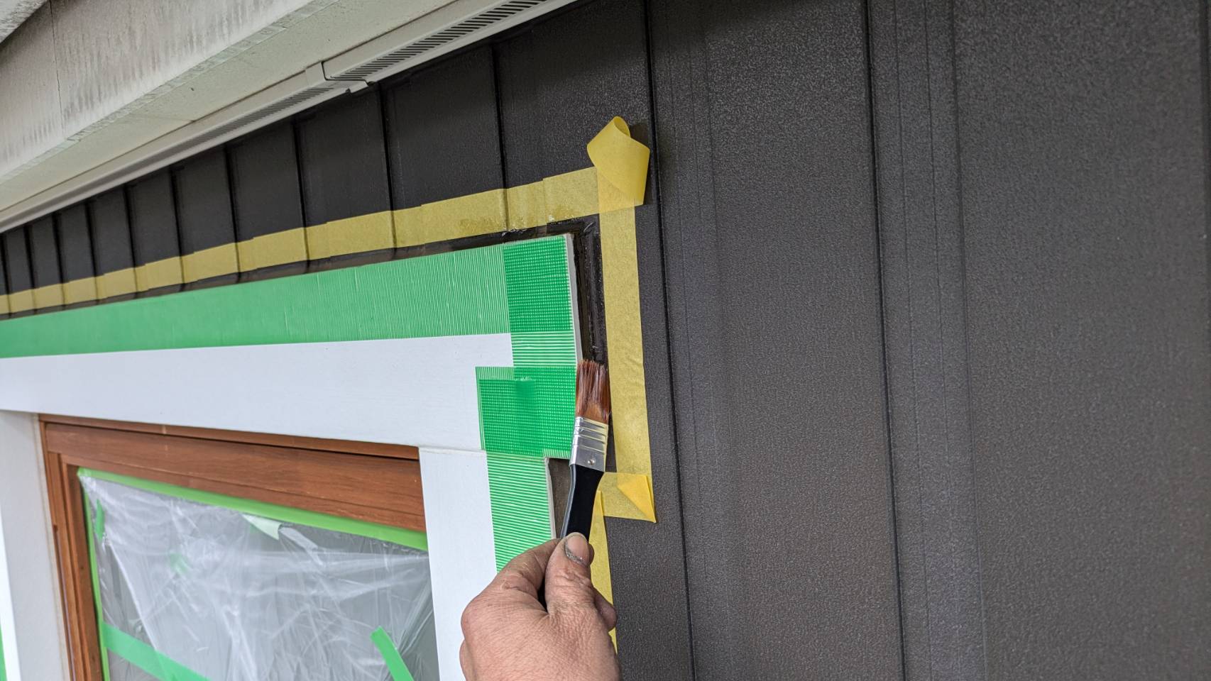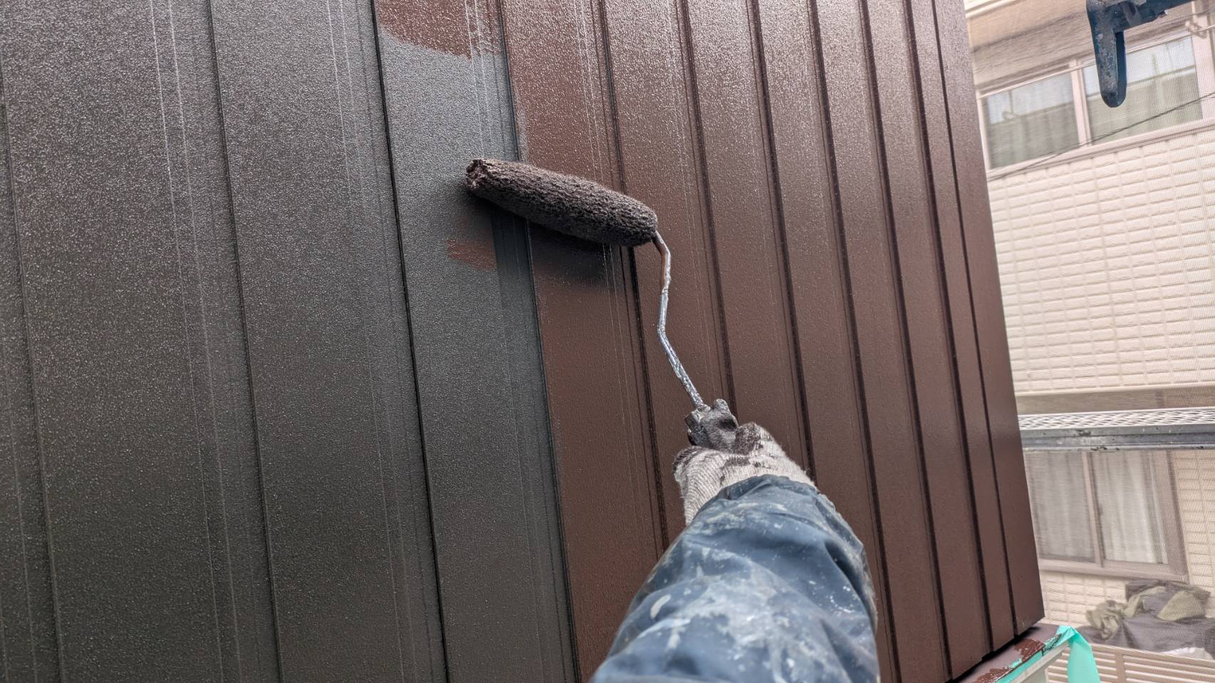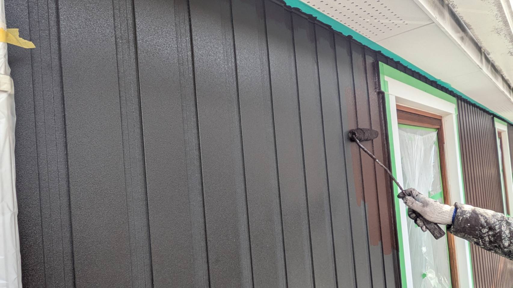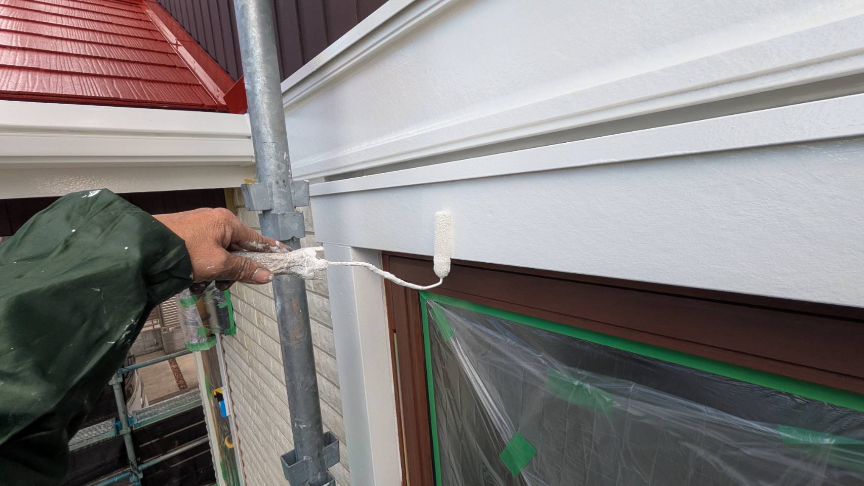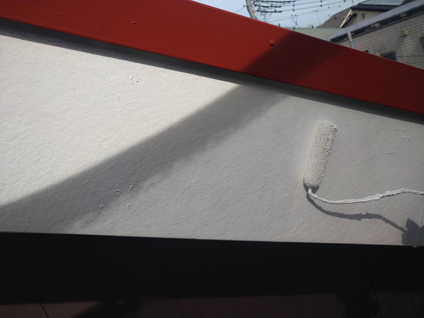破風板塗装 狭いすき間はハケ塗り。 全体はローラー塗り(膜厚を均一に塗りやすいローラーを使用します)
