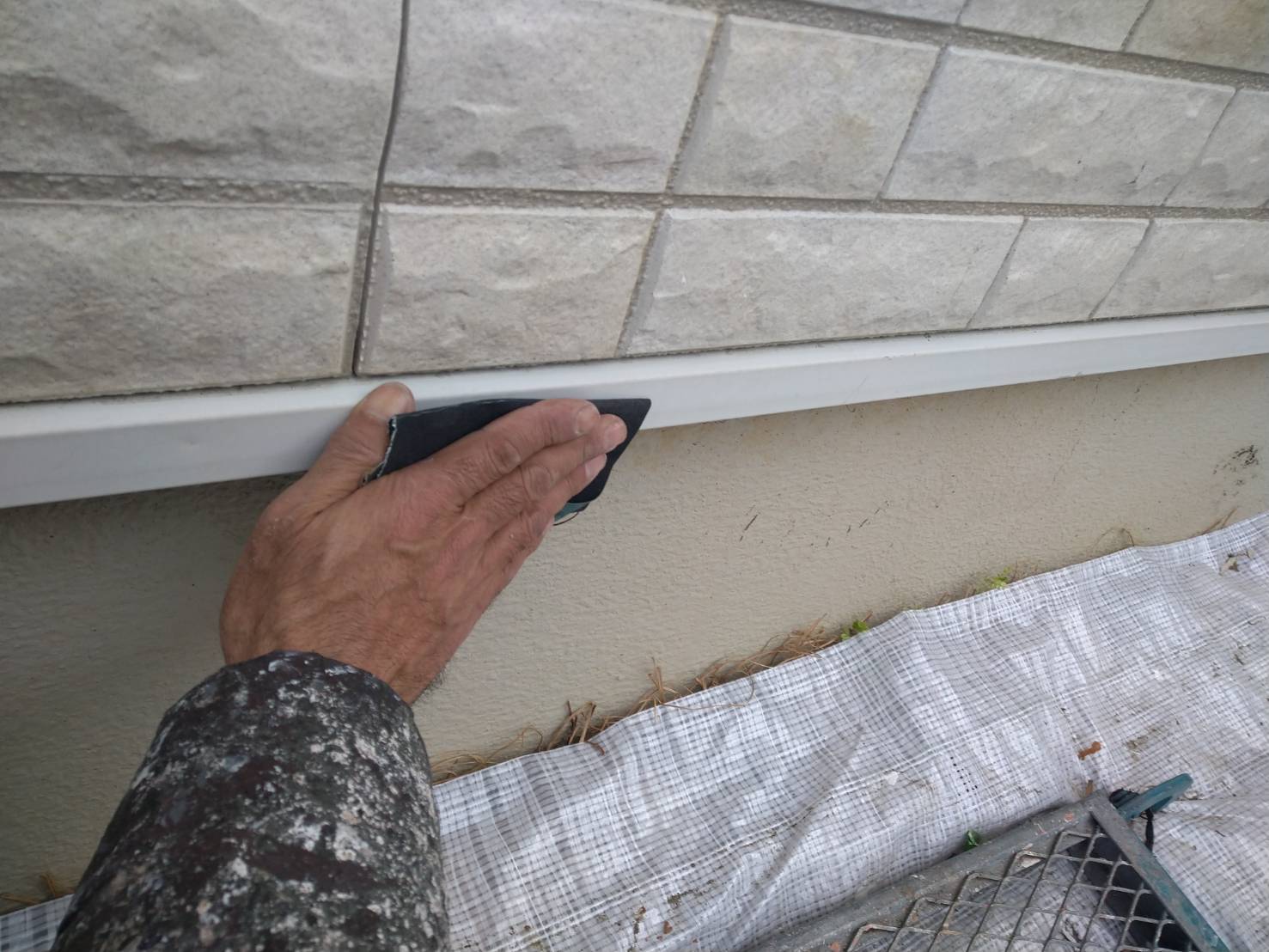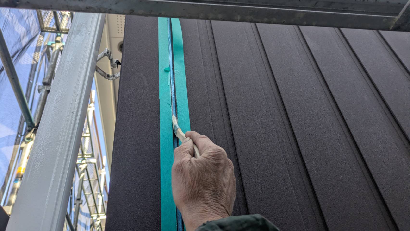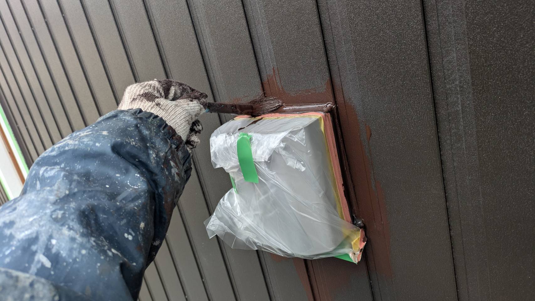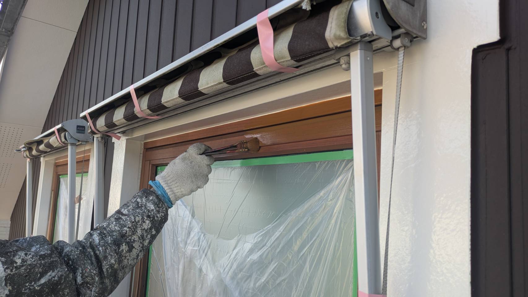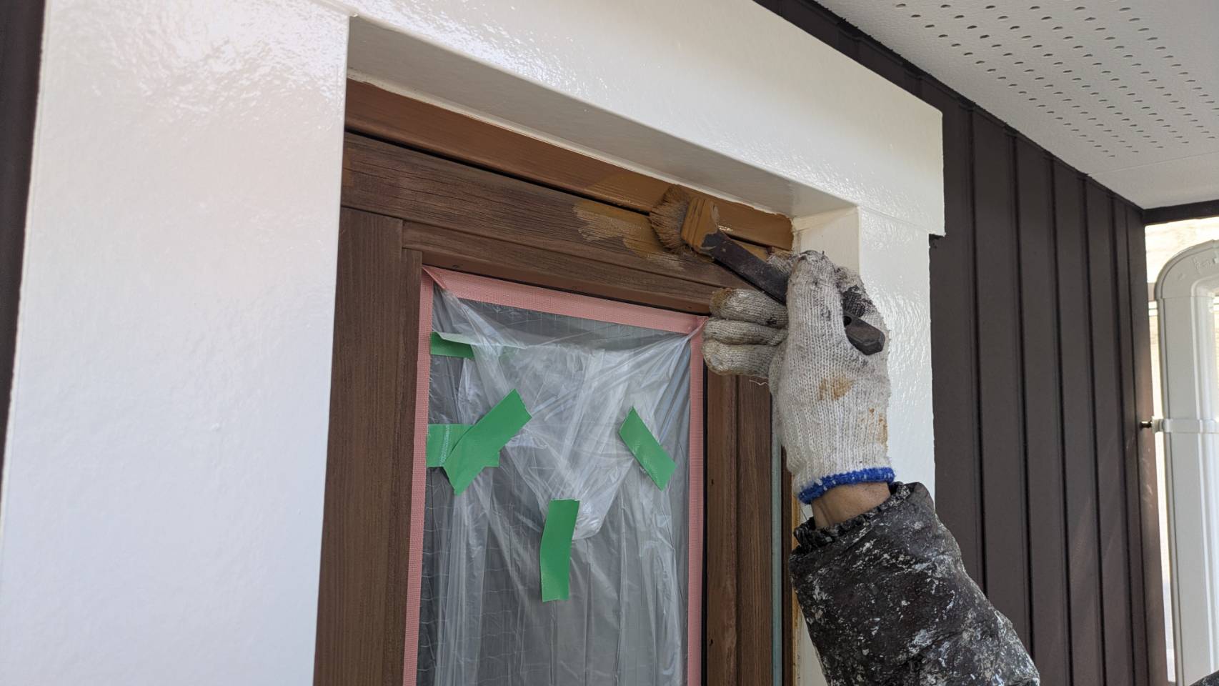 破風板塗装 狭いすき間はハケ塗り。 全体はローラー塗り(膜厚を均一に塗りやすいローラーを使用します)