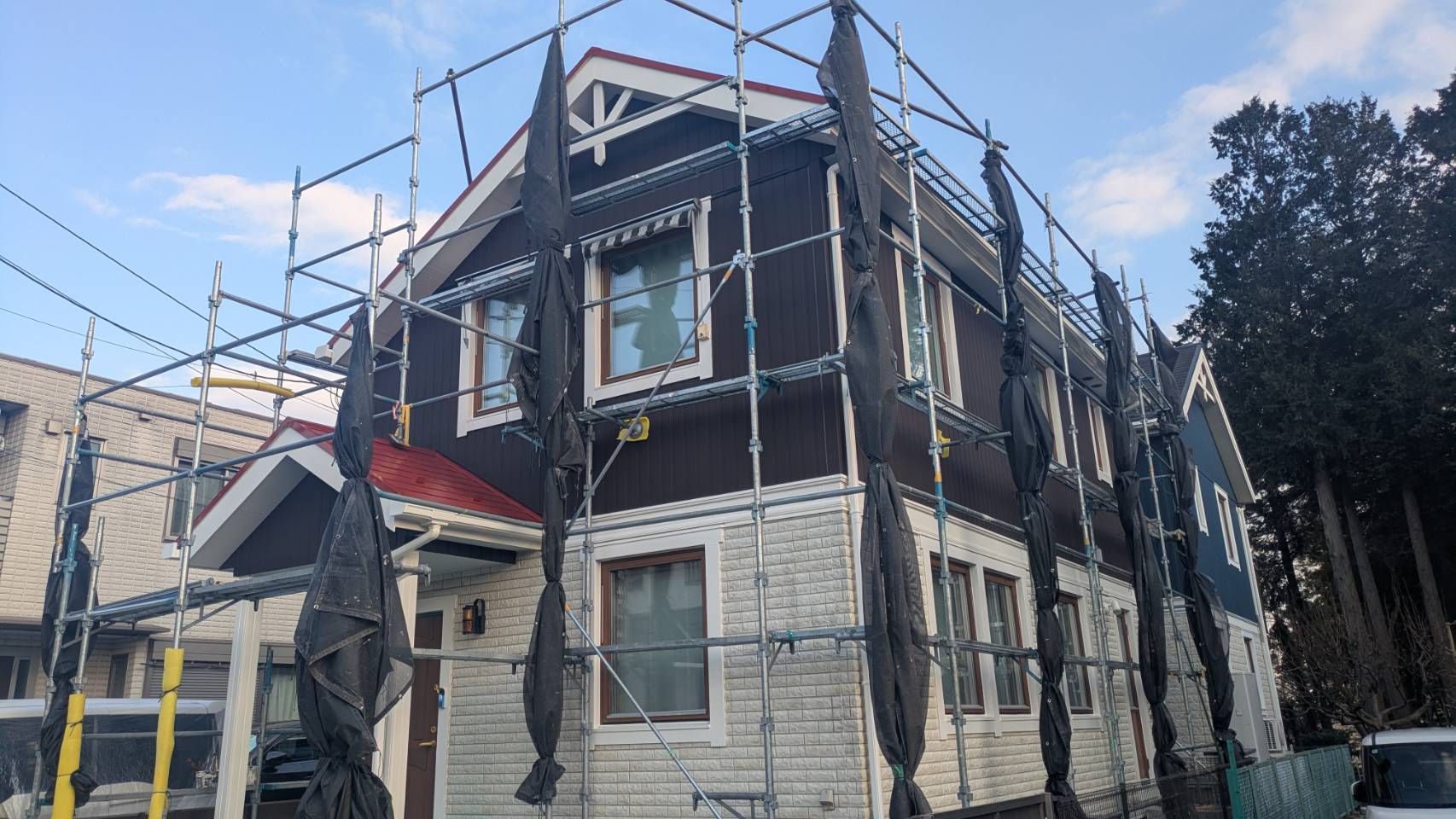 足場のネットを巻いて、後は足場の解体を待つところです!