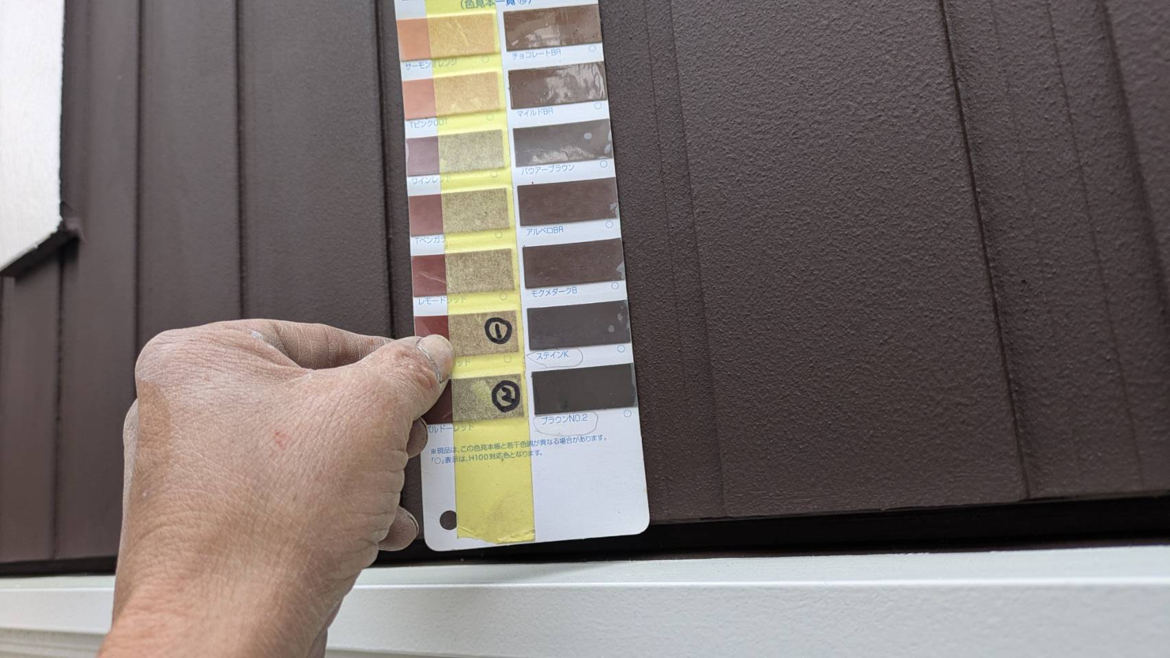 新しく注入する目地材の色合わせです。 外壁の仕上がりに合わせて手配します。