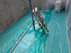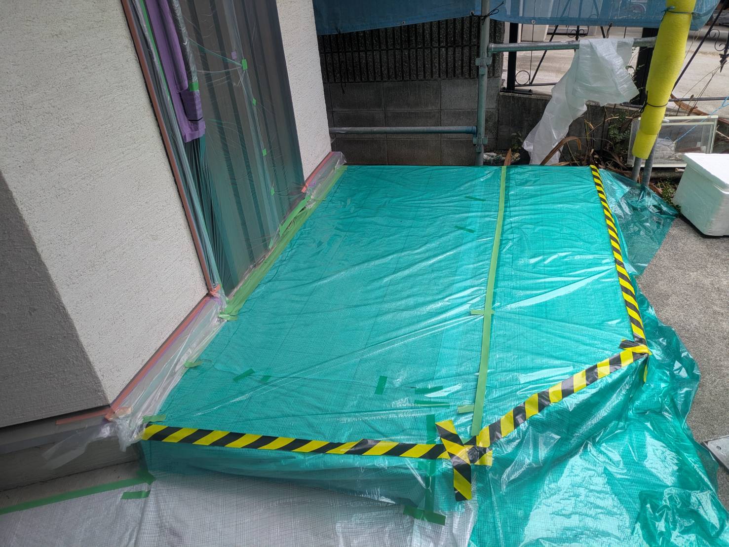 玄関まわりです。 緑のシートはノンスリップタイプの養生です。